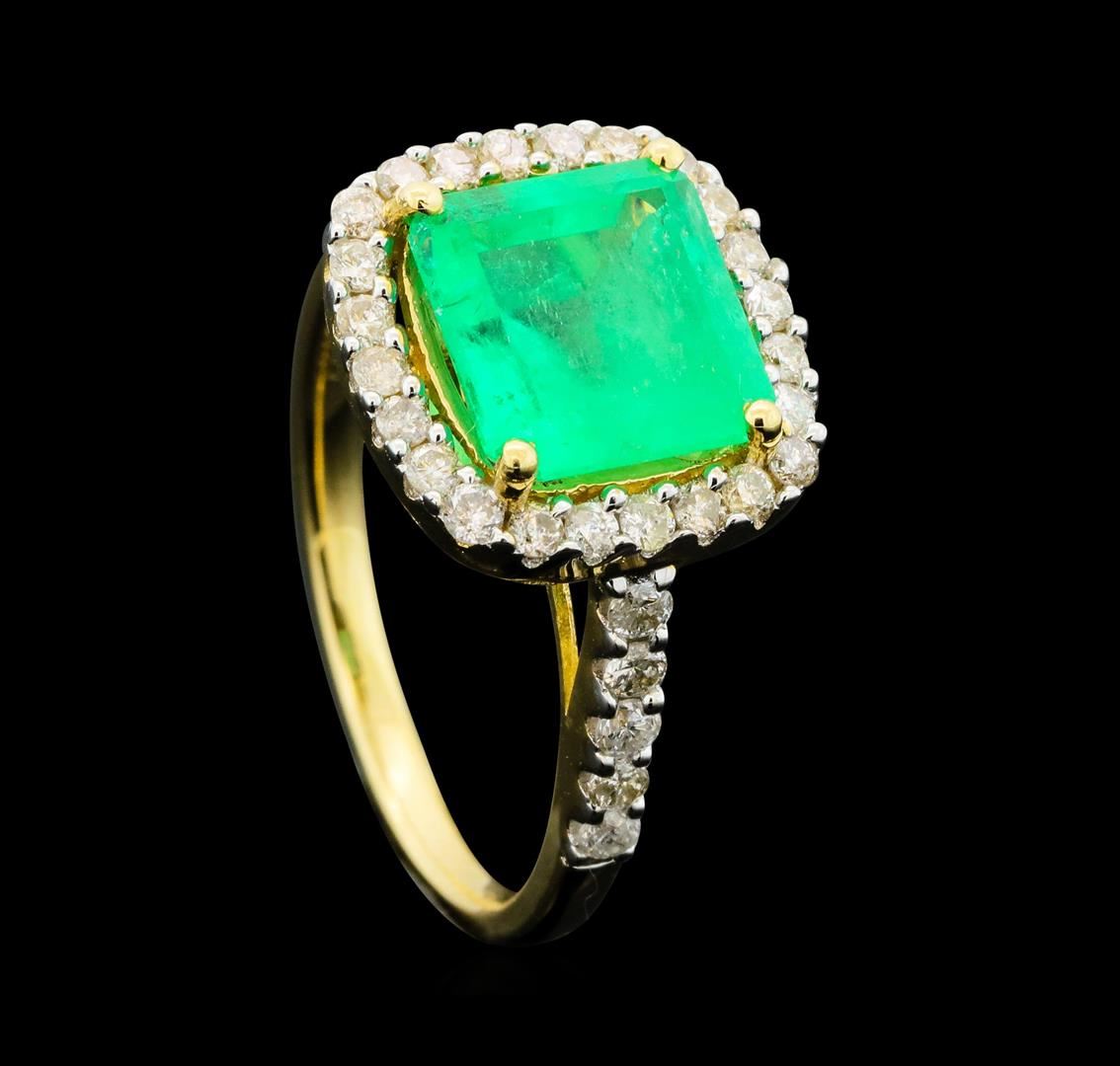 One electronically tested 14KT yellow gold ladies cast emerald and diamond ring. The featured emerald is set within a diamond bezel supported by a lattice under gallery and diamond set shoulders, completed by a two millimeter wide band. bright polish finish with rhodium accents. Trademark is A. I. Identified with markings of "14K". Condition is new, good workmanship. Containing: One prong set rectangular step cut natural emerald approximate weight of 2.80ct., clarity is moderately included, type III, medium dark, very slightly grayish, very slightly bluish green color, (GIA vslbG 6/3), cut is good. Transmitting light somewhat diffusely,transparent to translucent. Naturally occurring internal & external characteristics arepresent. Indications of oil residue. Graded in the setting.Thirty-Four prong set round brilliant cut diamonds approximate total weight of 34 Stones = 0.57ct. Graded in the setting. Clarity: I-1 to I-2. Color: G - I. Total Weight of Colored Stones 2.80ct. Total Weight of Diamonds 0.57ct. Total Weight of Ring 3.97gm. AIG Appraised.