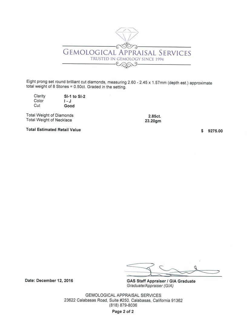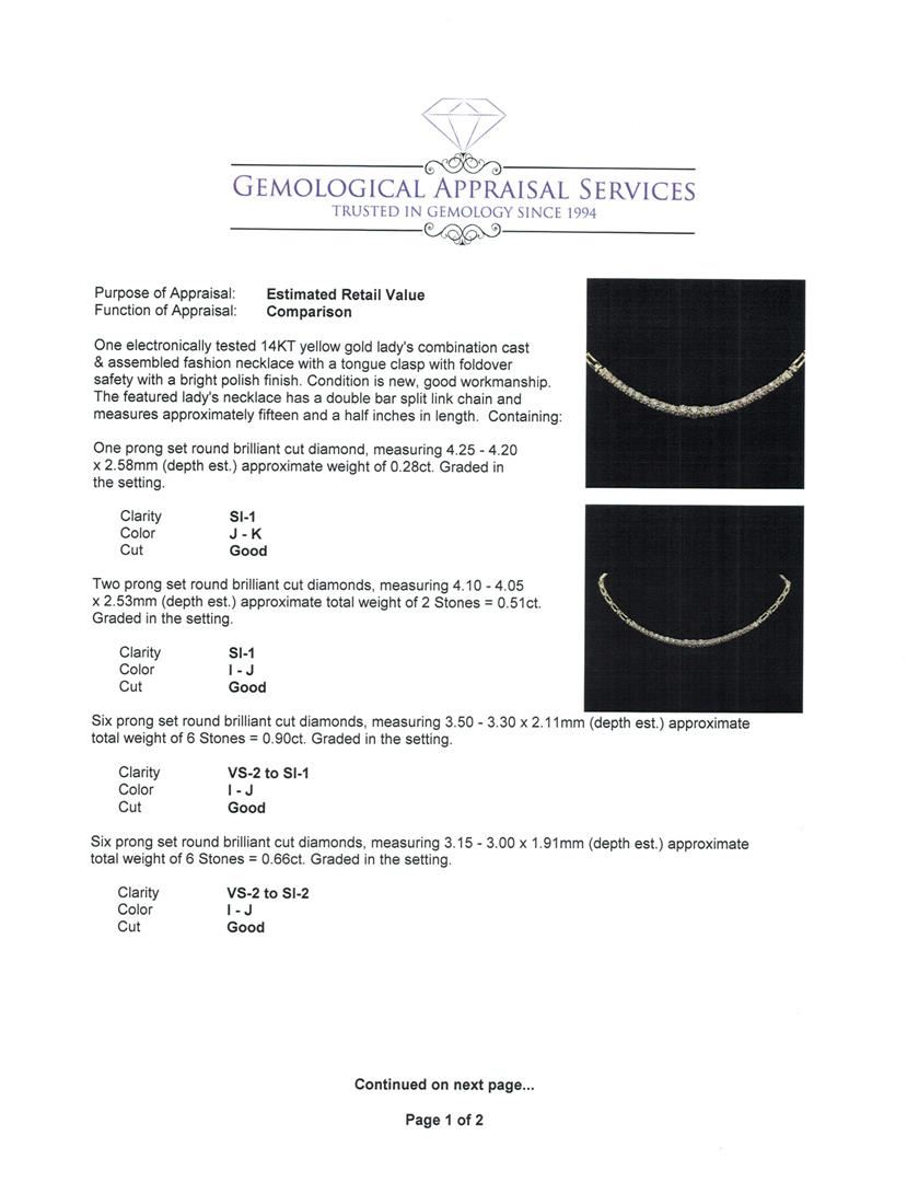One electronically tested 14KT yellow gold lady's combination cast & assembled fashion necklace with a tongue clasp with fold over safety with a bright polish finish. The featured lady's necklace has a double bar split link chain and measures approximately fifteen and a half inches in length. Condition is new, good workmanship. Containing: One prong set round brilliant cut diamond, measuring 4.25 - 4.20 x 2.58mm (depth est.) approximate weight of 0.28ct. Graded in the setting. Clarity: SI-1. Color: J - KCut Good Two prong set round brilliant cut diamonds, measuring 4.10 - 4.05 x 2.53mm (depth est.) approximate total weight of 2 Stones = 0.51ct. Graded in the setting. Clarity: SI-1. Color: I - JCut Good Six prong set round brilliant cut diamonds, measuring 3.50 - 3.30 x 2.11mm (depth est.) approximate total weight of 6 Stones = 0.90ct. Graded in the setting. Clarity: VS-2 to SI-1. Color: I - JCut Good Six prong set round brilliant cut diamonds, measuring 3.15 - 3.00 x 1.91mm (depth est.) approximate total weight of 6 Stones = 0.66ct. Graded in the setting. Clarity: VS-2 to SI-2. Color: I - JCut Good Eight prong set round brilliant cut diamonds, measuring 2.60 - 2.45 x 1.57mm (depth est.) approximate total weight of 8 Stones = 0.50ct. Graded in the setting. Clarity: SI-1 to SI-2. Color: I - JCut Good. Total Weight of Diamonds 2.85ct. Total Weight of Necklace 23.20gm. GAS Appraised at $9,275.00.