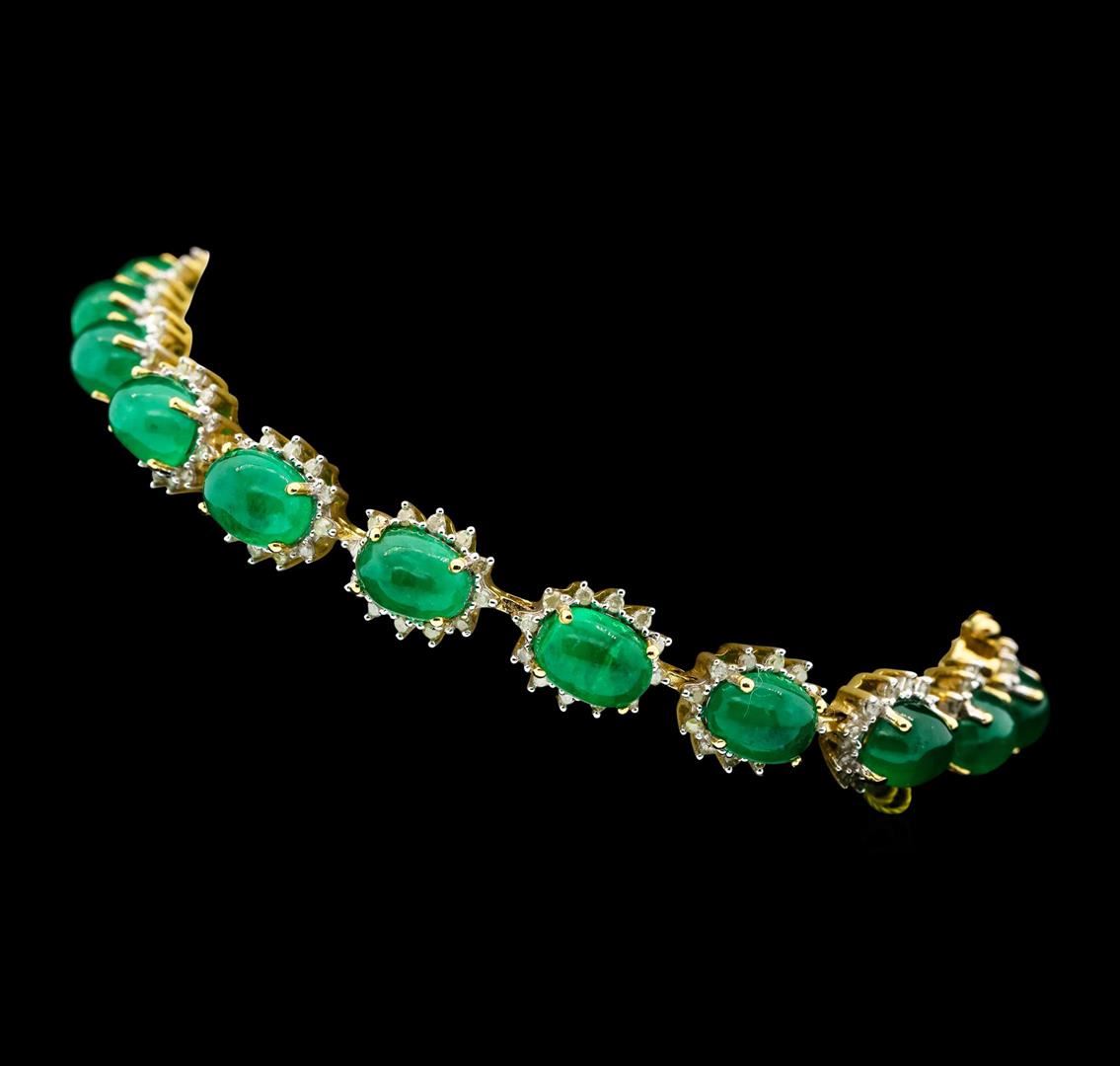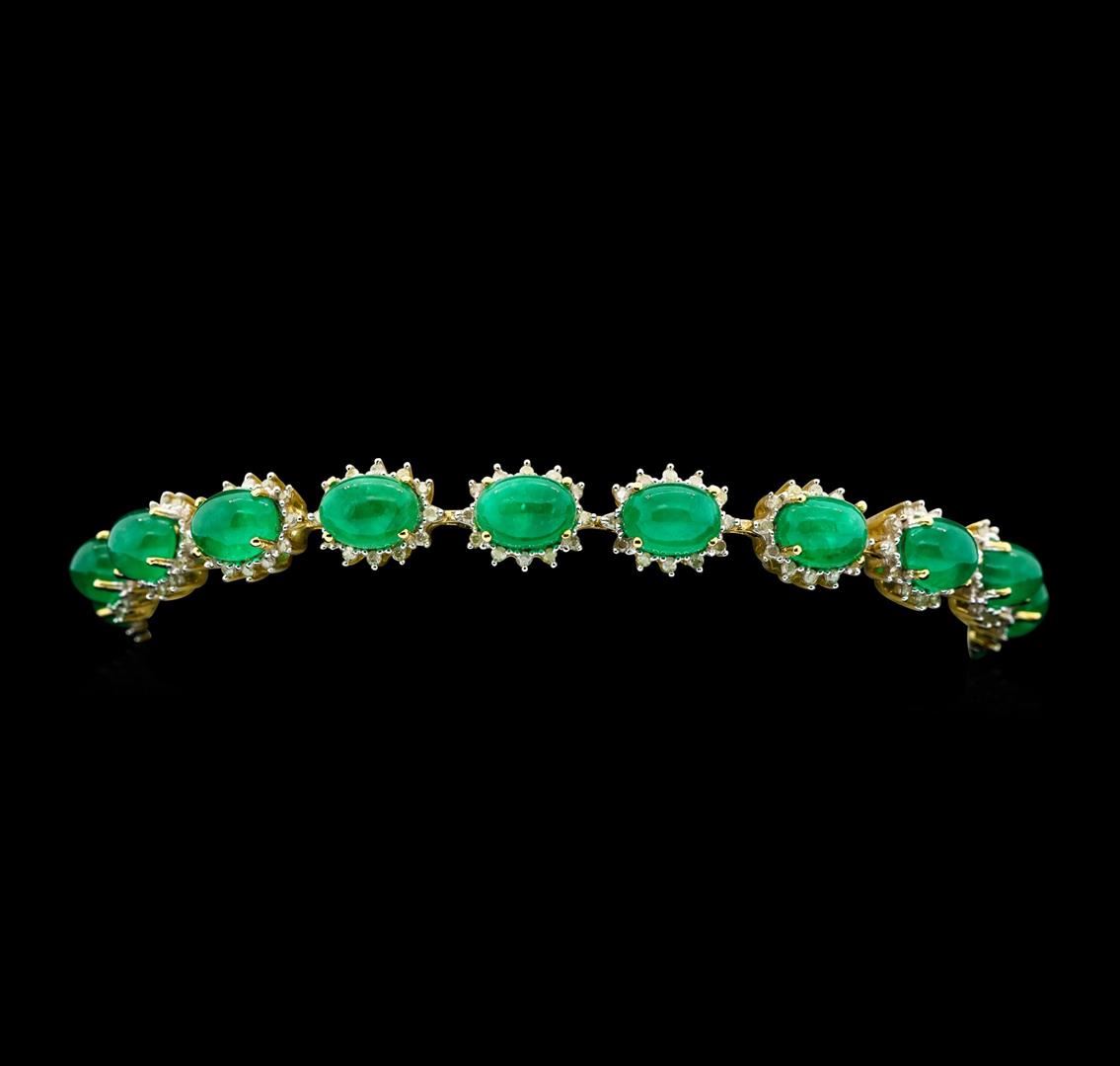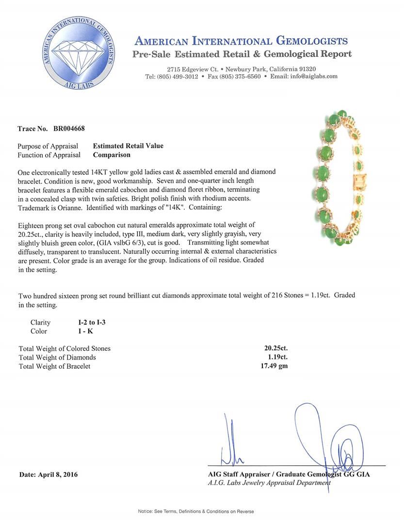 One electronically tested 14KT yellow gold ladies cast & assembled emerald and diamond bracelet. Seven and one-quarter inch length bracelet features a flexible emerald cabochon and diamond floret ribbon, terminating in a concealed clasp with twin safeties. Bright polish finish with rhodium accents. Trademark is Orianne. Identified with markings of "14K". Condition is new, good workmanship. Containing: Eighteen prong set oval cabochon cut natural emeralds approximate total weight of 20.25ct., clarity is heavily included, type III, medium dark, very slightly grayish, very slightly bluish green color, (GIA vslbG 6/3), cut is good. Transmitting light somewhat diffusely, transparent to translucent. Naturally occurring internal & external characteristics are present. Color grade is an average for the group. Indications of oil residue. Graded in the setting.Two Hundred Sixteen prong set round brilliant cut diamonds approximate total weight of 216 Stones = 1.19ct. Graded in the setting. Clarity: I-2 to I-3. Color: I - K. Total Weight of Colored Stones 20.25ct. Total Weight of Diamonds 1.19ct. Total Weight of Bracelet 17.49gm. AIG Appraised.
