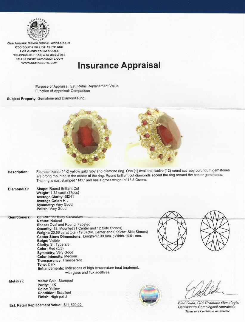 One fourteen karat (14KT) yellow gold ruby and diamond ring. One oval and twelve round cut ruby corundum gemstones are prong mounted in the center of the ring. Round brilliant cut diamonds, average clarity SI2-I1, average color H-J, weighing 1.32 carats, accent the ring around the center gemstone. The ring is cast stamped "14K" and has a gross weight of 13.5 Grams. GGA Appraised at $11,520.00.