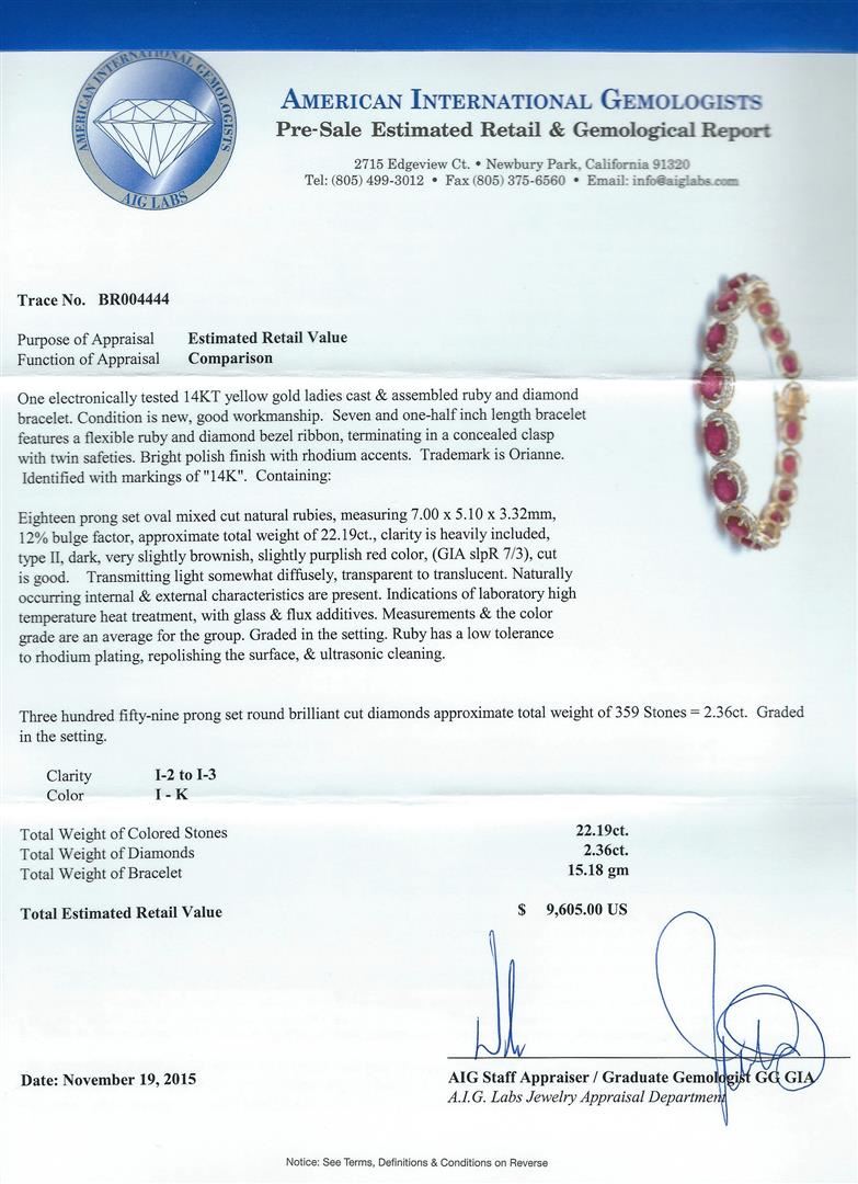 One electronically tested 14KT yellow gold ladies cast & assembled ruby and diamond bracelet. Seven and one-half inch length bracelet features a flexible ruby and diamond bezel ribbon, terminating in a concealed clasp with twin safeties. Bright polish finish with rhodium accents. Trademark is Orianne. Identified with markings of "14K". Condition is new, good workmanship. Containing: Eighteen prong set oval mixed cut natural rubies, measuring 7.00 x 5.10 x 3.32mm, 12%. bulge factor, approximate. Total Weight of 22.19ct., clarity is heavily included, type II, dark, very slightly brownish, slightly purplish red color, (GIA slpR 7/3), cut is good. Transmitting light somewhat diffusely, transparent to translucent. Naturally occurring internal & external characteristics are present. Indications of laboratory hightemperature heat treatment, with glass & flux additives. Measurements & the colorgrade are an average for the group. Graded in the setting. Ruby has a low toleranceto rhodium plating, repolishing the surface, & ultrasonic cleaning.Three Hundred Fifty-Nine prong set round brilliant cut diamonds approximate. Total Weight of 359 Stones = 2.36ct. Graded in the setting. Clarity: I-2 to I-3. Color: I - K. Total Weight of Colored Stones 22.19ct. Total Weight of Diamonds 2.36ct. Total Weight of Bracelet 15.18gm. AIG Appraised at $9,605.00.