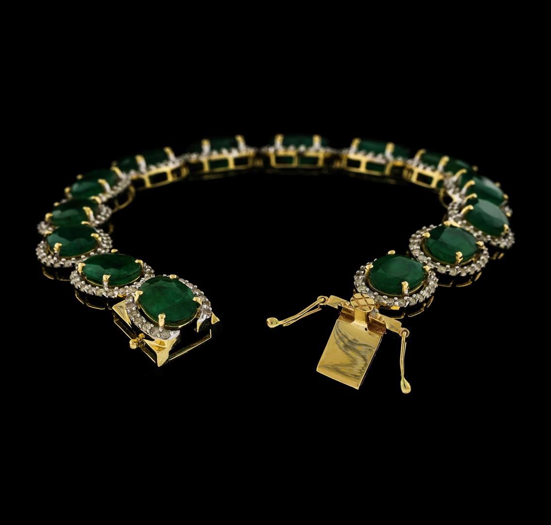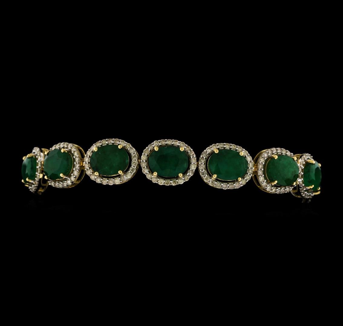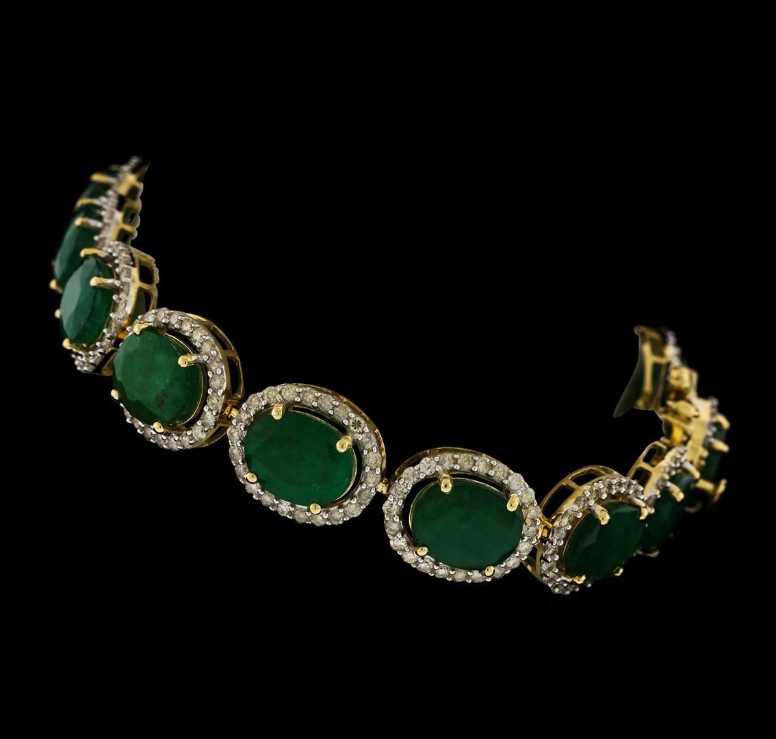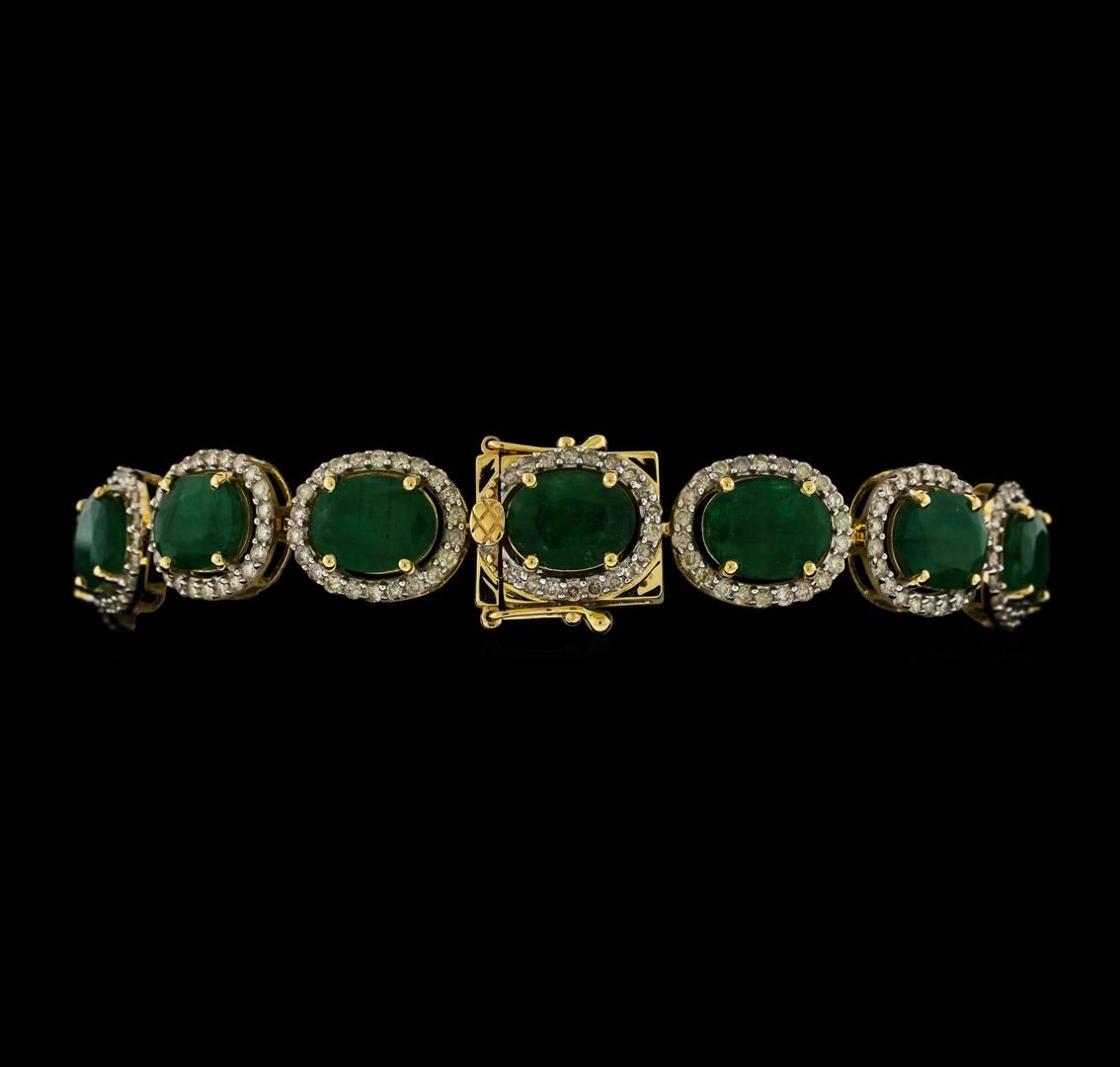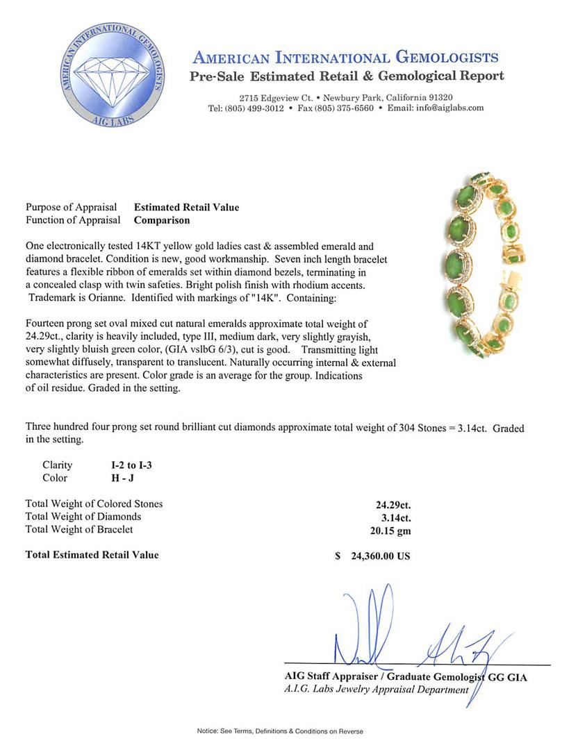 One electronically tested 14KT yellow gold ladies cast & assembled emerald and diamond bracelet. Seven inch length bracelet features a flexible ribbon of emeralds set within diamond bezels, terminating in a concealed clasp with twin safeties. Bright polish finish with rhodium accents. Trademark is Orianne. Identified with markings of "14K". Condition is new, good workmanship. Containing: Fourteen prong set oval mixed cut natural emeralds approximate total weight of 24.29ct., clarity is heavily included, type III, medium dark, very slightly grayish, very slightly bluish green color, (GIA vslbG 6/3), cut is good. Transmitting light somewhat diffusely, transparent to translucent. Naturally occurring internal & external characteristics are present. Color grade is an average for the group. Indications of oil residue. Graded in the setting. Three Hundred Four prong set round brilliant cut diamonds approximate total weight of 304 Stones = 3.14ct. Graded in the setting. Clarity: I-2 to I-3. Color: H - J. Total Weight of Colored Stones 24.29ct. Total Weight of Diamonds 3.14ct. Total Weight of Bracelet 20.15gm. AIG Appraised at $24,360.00.