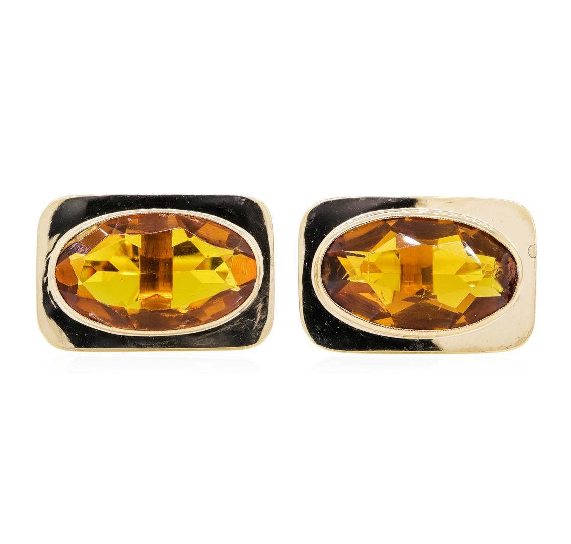 One pair of cufflinks featuring: 14KT yellow gold weighing 19.2 grams containing two citrine quartzes weighing 25.00ctw. One of the citrine quartz stones is chipped.