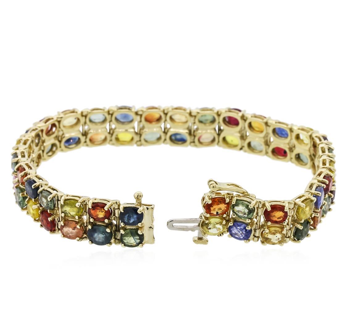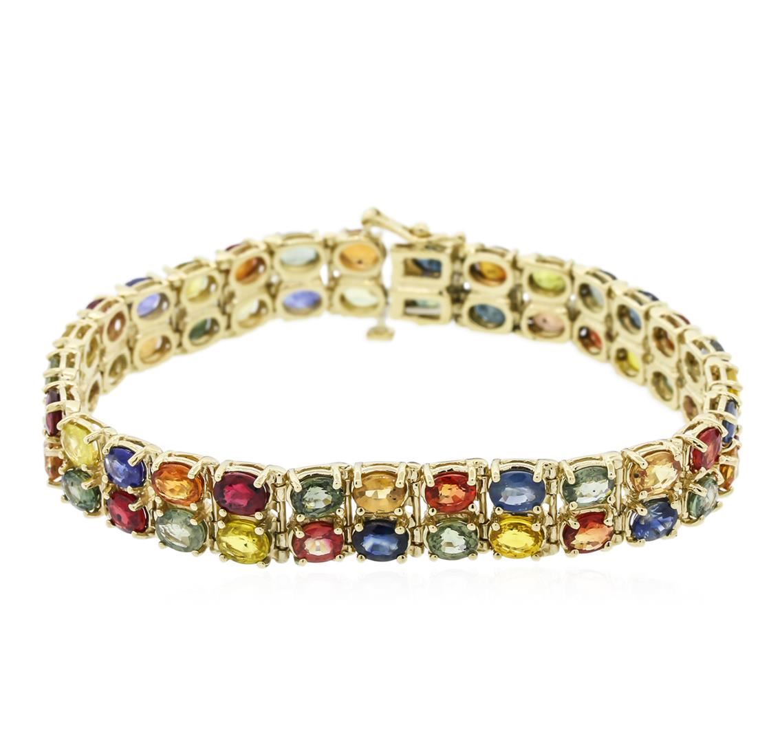 One electronically tested 14KT yellow gold lady's combination cast & assembled fashion bracelet with a tongue clasp with foldover safety with a bright polish finish. The featured lady's bracelet has a double row straightline motif and measures 7 inches in length. Identified with markings of "14K". Condition is new, good workmanship. Containing: Fifty-six prong set oval modified brilliant cut natural multi-color sapphires, measuring 5.00 x 3.50 x 2.75mm, 5% bulge factor, approximate total weight of 26.50ct., clarity is slightly included, cut is good. The featured multi-colored sapphires vary in hue from blue to yellow to green to pink to orange to orangy-red to red. Colored gemstones are presumed to have been subjected to commonly used enhancement processes. Naturally occurring internal & external characteristics are present. Graded in the setting. Total Weight of Colored Stones 26.50ct. Total Weight of Bracelet 26.30gm. GAS Appraised at $12,880.00.