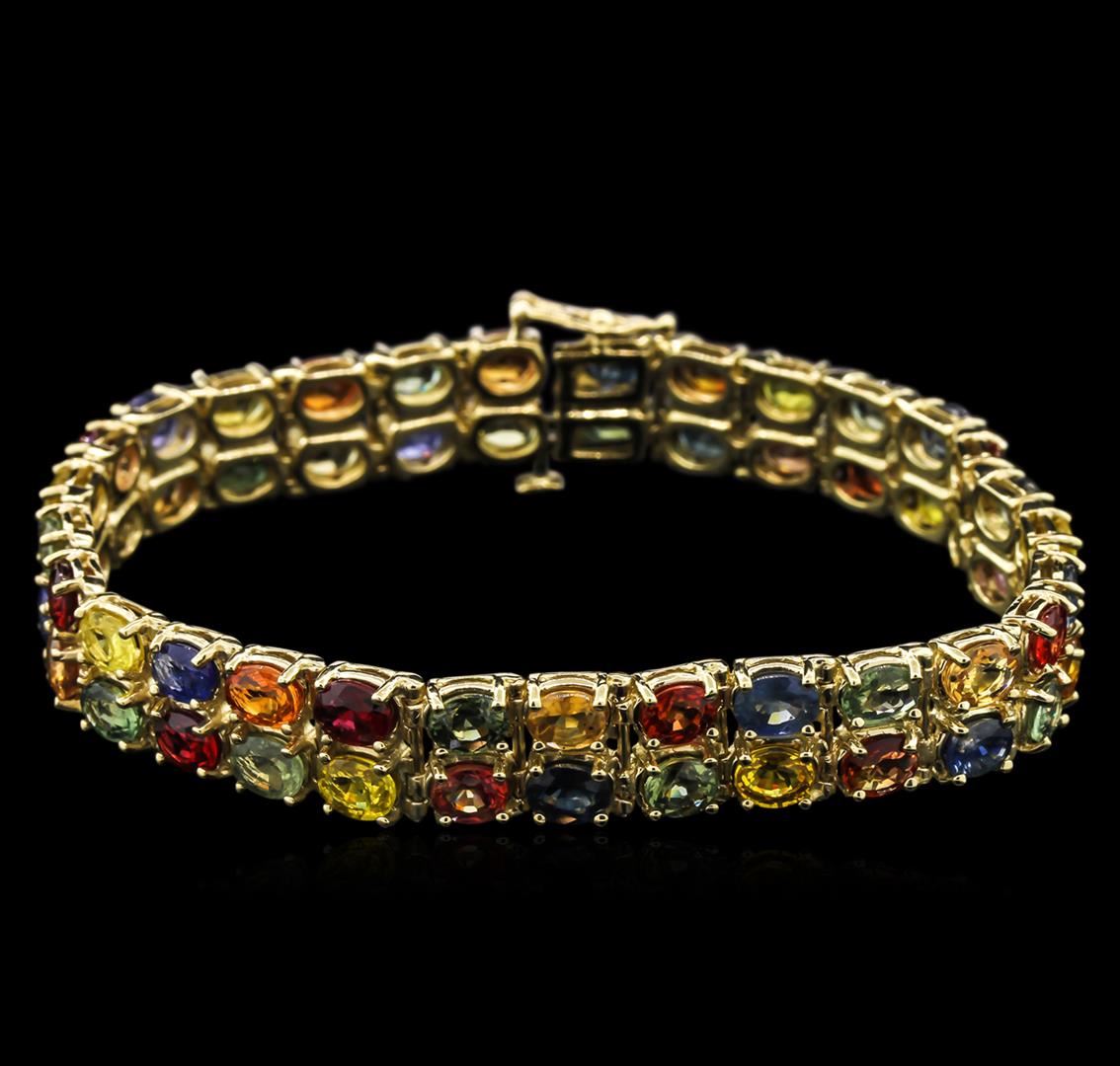 One electronically tested 14KT yellow gold lady's combination cast & assembled fashion bracelet with a tongue clasp with foldover safety with a bright polish finish. The featured lady's bracelet has a double row straightline motif and measures 7 inches in length. Identified with markings of "14K". Condition is new, good workmanship. Containing: Fifty-six prong set oval modified brilliant cut natural multi-color sapphires, measuring 5.00 x 3.50 x 2.75mm, 5% bulge factor, approximate total weight of 26.50ct., clarity is slightly included, cut is good. The featured multi-colored sapphires vary in hue from blue to yellow to green to pink to orange to orangy-red to red. Colored gemstones are presumed to have been subjected to commonly used enhancement processes. Naturally occurring internal & external characteristics are present. Graded in the setting. Total Weight of Colored Stones 26.50ct. Total Weight of Bracelet 26.30gm. GAS Appraised at $12,880.00.