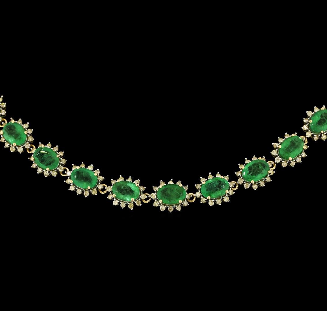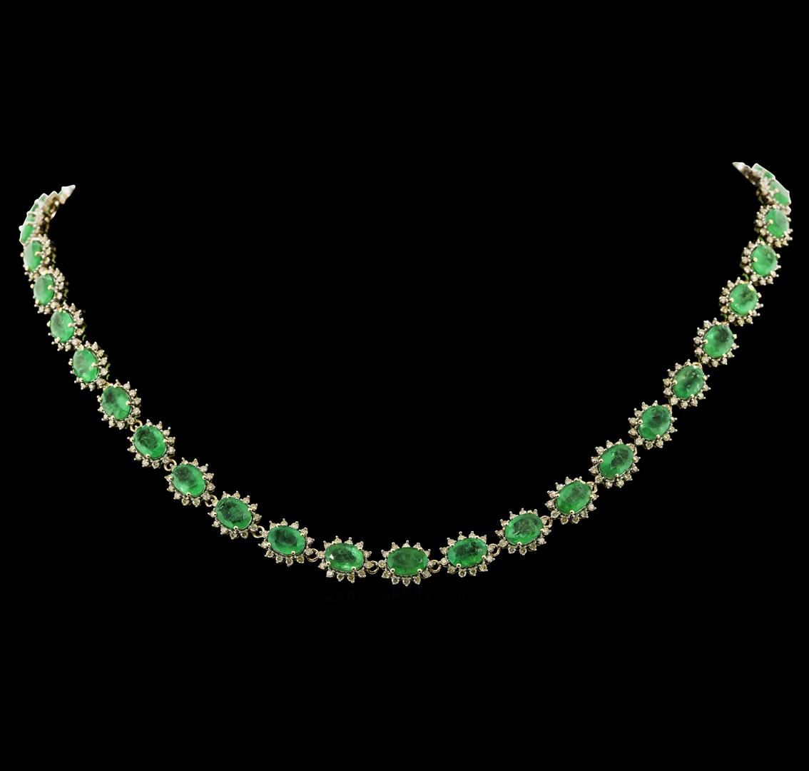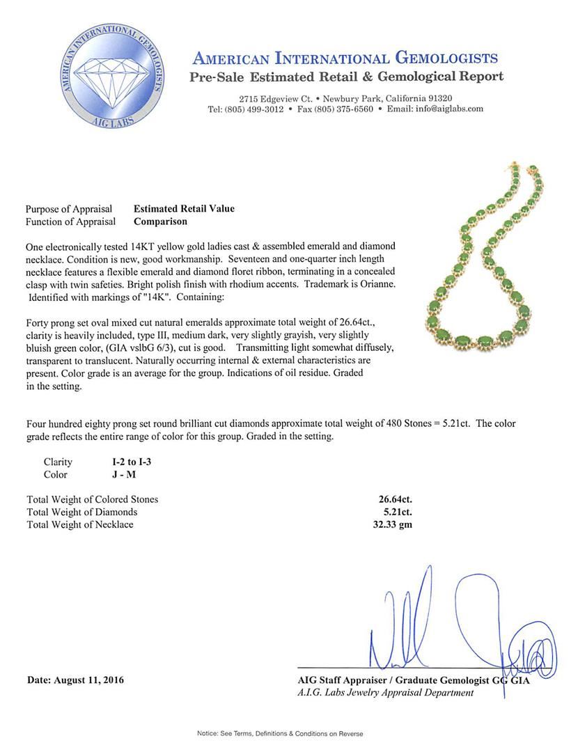 One electronically tested 14KT yellow gold ladies cast & assembled emerald and diamond necklace. Seventeen and one-quarter inch length necklace features a flexible emerald and diamond floret ribbon, terminating in a concealed clasp with twin safeties. Bright polish finish with rhodium accents. Trademark is Orianne. Identified with markings of "14K". Condition is new, good workmanship. Containing: Forty prong set oval mixed cut natural emeralds approximate total weight of 26.64ct., clarity is heavily included, type III, medium dark, very slightly grayish, very slightly bluish green color, (GIA vslbG 6/3), cut is good. Transmitting light somewhat diffusely, transparent to translucent. Naturally occurring internal & external characteristics are present. Color grade is an average for the group. Indications of oil residue. Graded in the setting. Four Hundred Eighty prong set round brilliant cut diamonds approximate total weight of 480 Stones = 5.21ct. The color grade reflects the entire range of color for this group. Graded in the setting. Clarity: I-2 to I-3. Color: J - M. Total Weight of Colored Stones 26.64ct. Total Weight of Diamonds 5.21ct. Total Weight of Necklace 32.33gm. AIG Appraised.