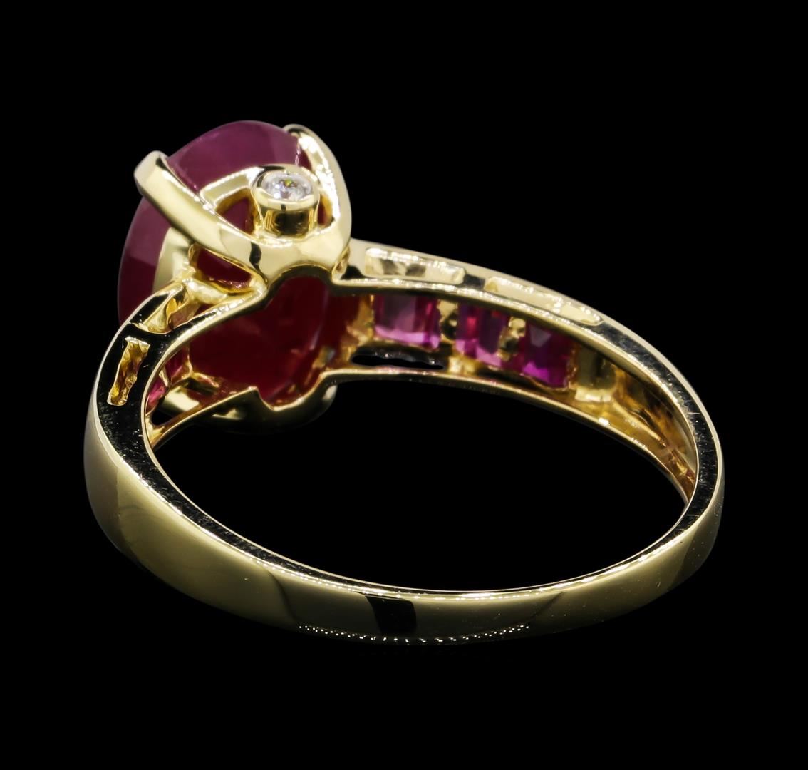 One Ladies ring featuring: 14KT yellow gold weighing containing one center ruby weighing 2.52ctw, side rubies weighing 0.48ctw and diamonds weighing 0.04ctw.