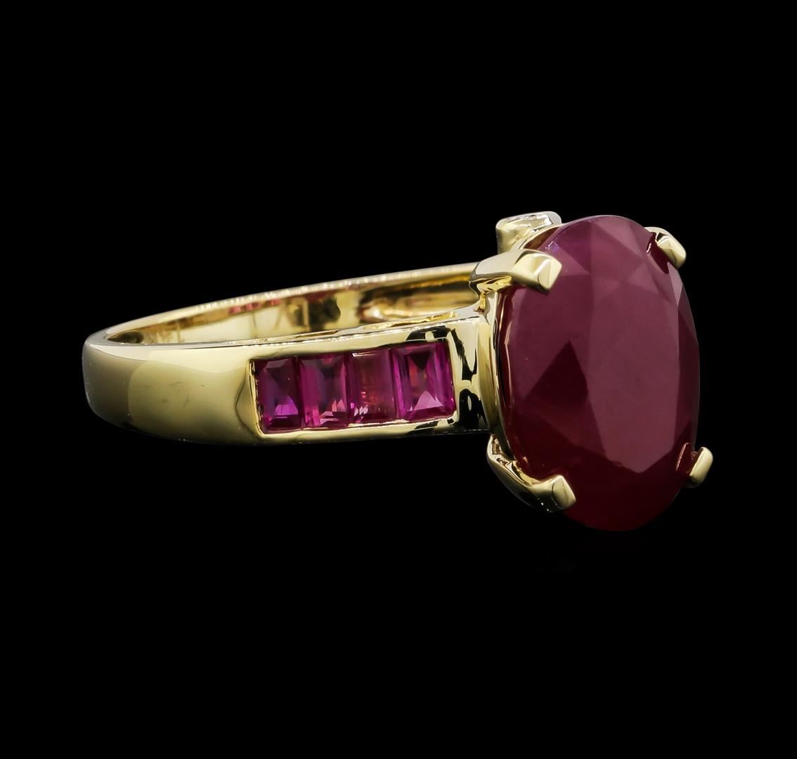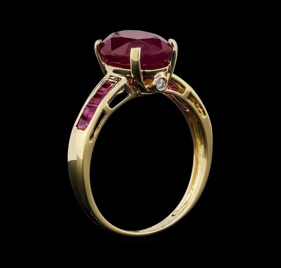 One Ladies ring featuring: 14KT yellow gold weighing containing one center ruby weighing 2.52ctw, side rubies weighing 0.48ctw and diamonds weighing 0.04ctw.