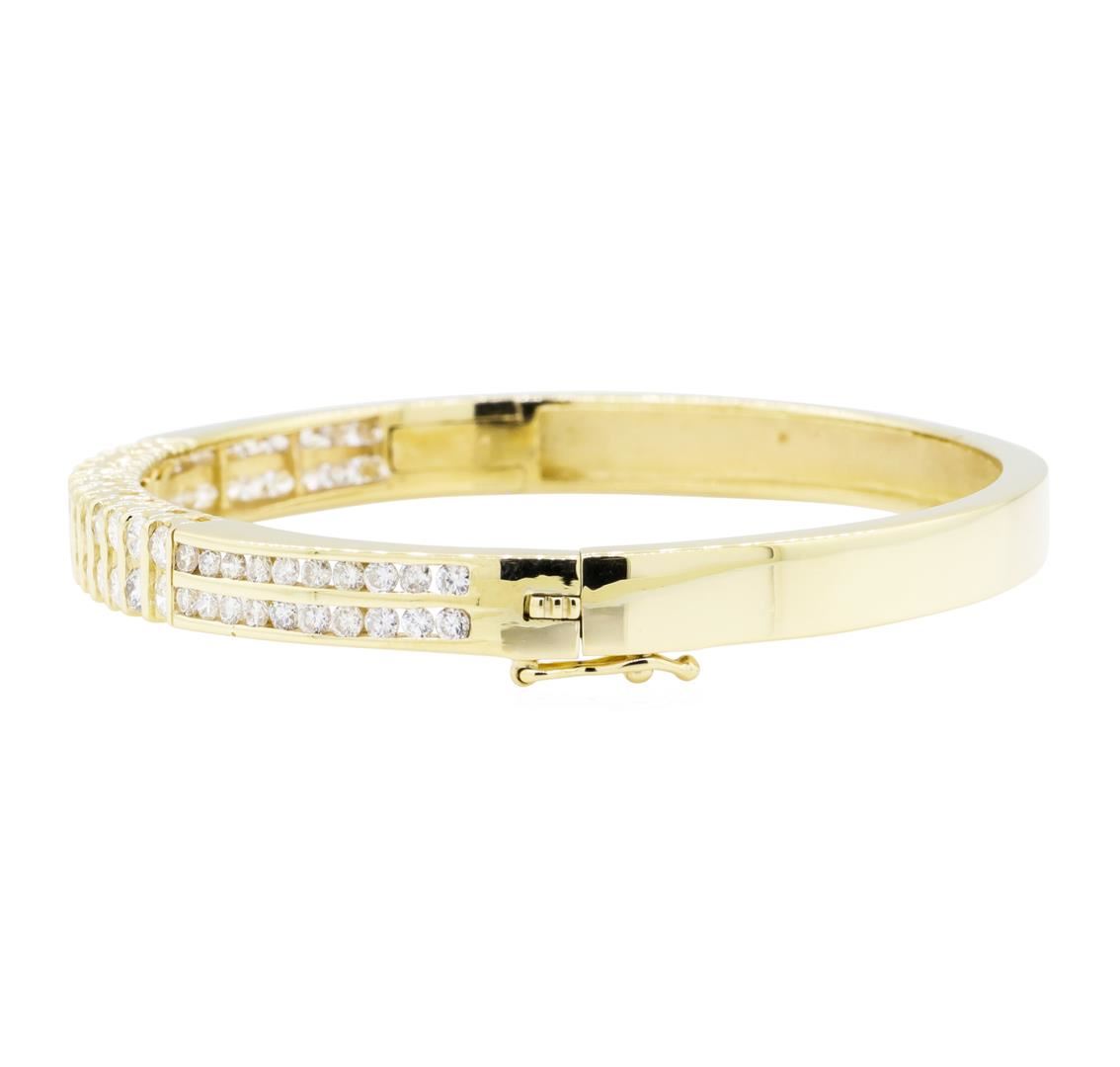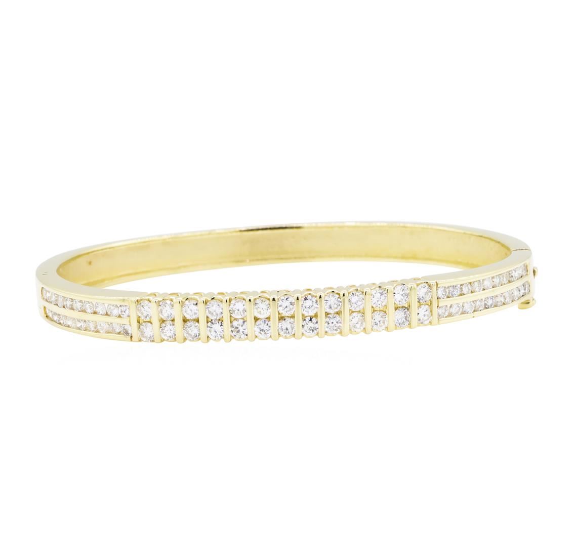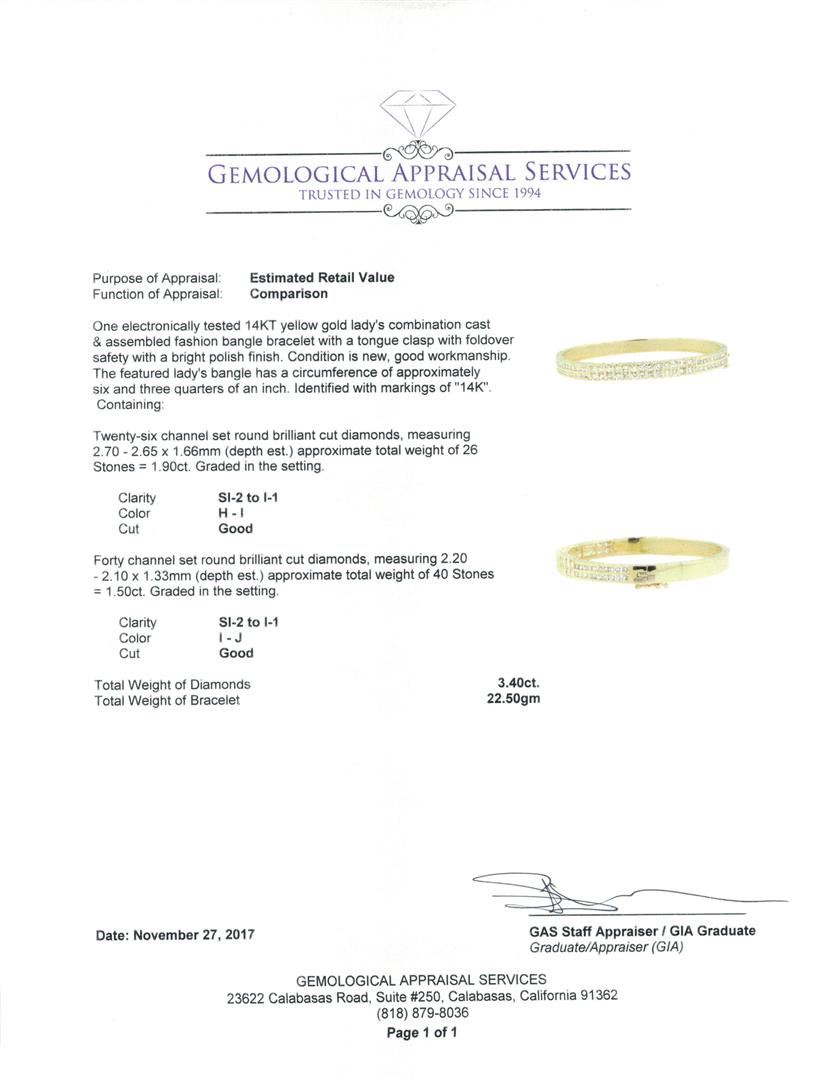 One electronically tested 14KT yellow gold lady's combination cast & assembled fashion bangle bracelet with a tongue clasp with foldover safety with a bright polish finish. The featured lady's bangle has a circumference of approximately six and three quarters of an inch. Identified with markings of '14K'. Condition is new, good workmanship. Containing: Twenty-Six channel set round brilliant cut diamonds, measuring 2.70 - 2.65 x 1.66mm (depth est.) approximate total weight of 26 Stones = 1.90ct. Graded in the setting. Color H - I Clarity SI-2 to I-1 Cut Good Forty channel set round brilliant cut diamonds, measuring 2.20 - 2.10 x 1.33mm (depth est.) approximate total weight of 40 Stones = 1.50ct. Graded in the setting. Color I - J Clarity SI-2 to I-1 Cut Good. Total Weight of Diamonds 3.40ct.. Total Weight of Bracelet 22.50gm. GAS Appraised.