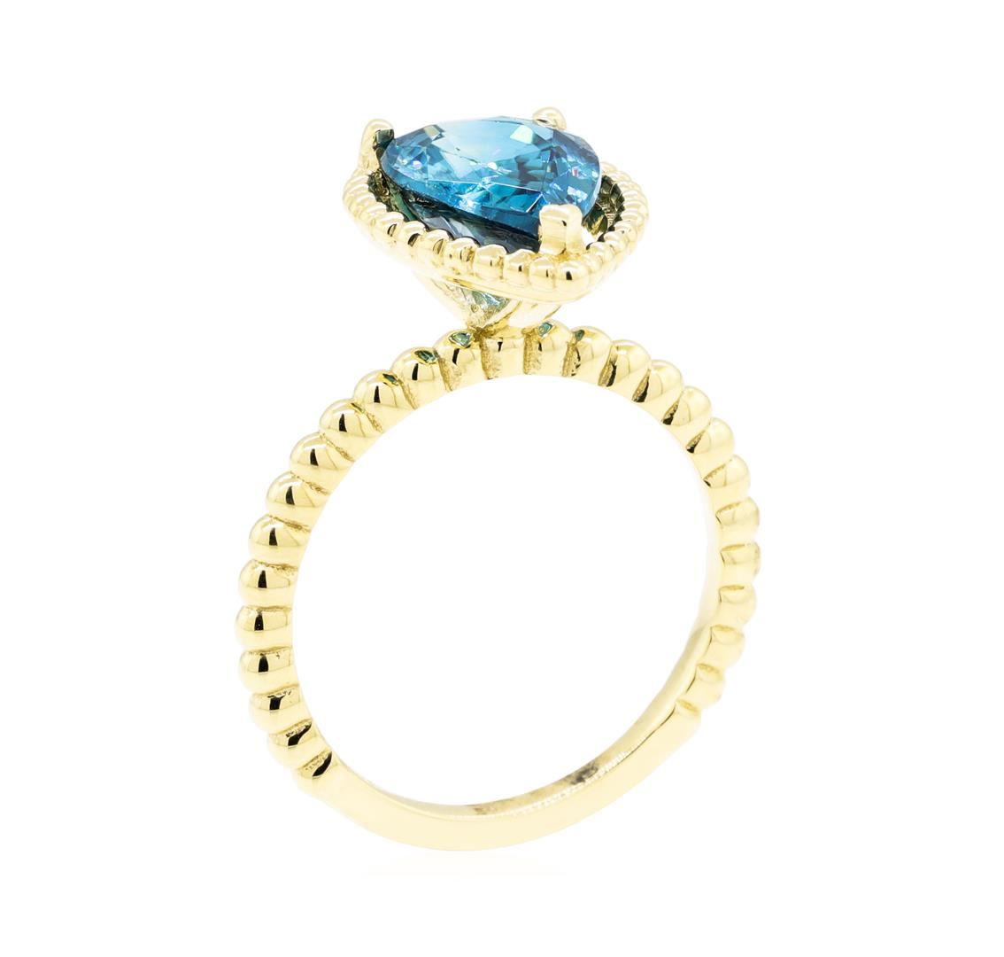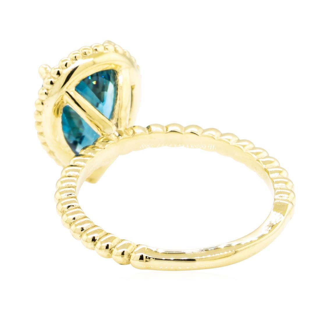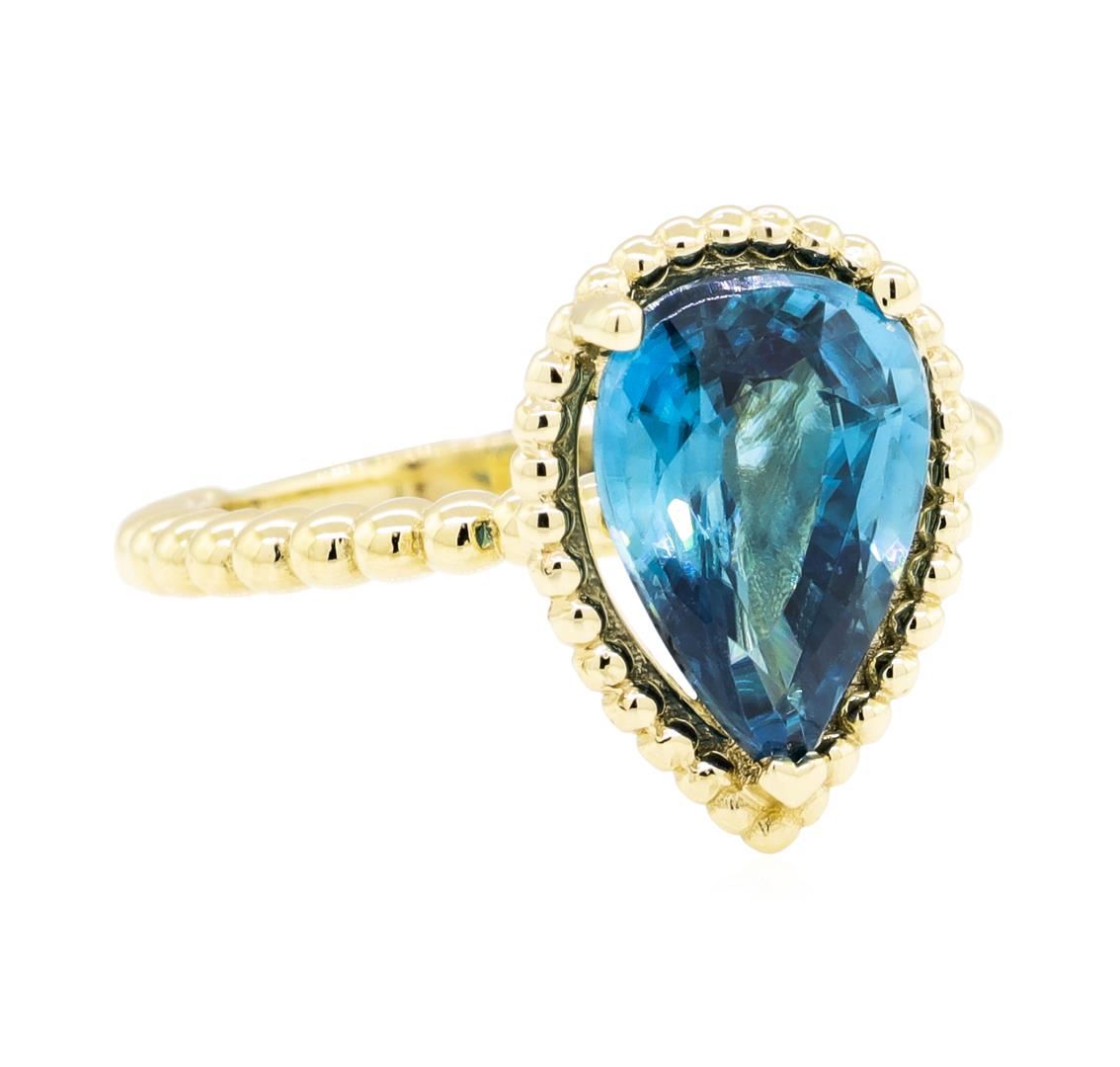 One ring featuring: 14KT yellow gold weighing 3.9 grams containing one blue zircon weighing 3.40ct. The ring is a size 5.5.