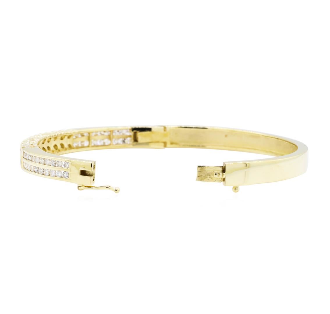 One electronically tested 14KT yellow gold lady's combination cast & assembled fashion bangle bracelet with a tongue clasp with foldover safety with a bright polish finish. The featured lady's bangle has a circumference of approximately six and three quarters of an inch. Identified with markings of '14K'. Condition is new, good workmanship. Containing: Twenty-Six channel set round brilliant cut diamonds, measuring 2.70 - 2.65 x 1.66mm (depth est.) approximate total weight of 26 Stones = 1.90ct. Graded in the setting. Color H - I Clarity SI-2 to I-1 Cut Good Forty channel set round brilliant cut diamonds, measuring 2.20 - 2.10 x 1.33mm (depth est.) approximate total weight of 40 Stones = 1.50ct. Graded in the setting. Color I - J Clarity SI-2 to I-1 Cut Good. Total Weight of Diamonds 3.40ct.. Total Weight of Bracelet 22.50gm. GAS Appraised.