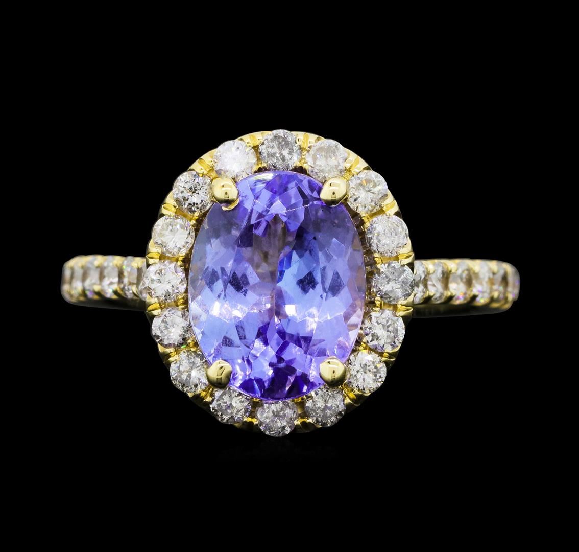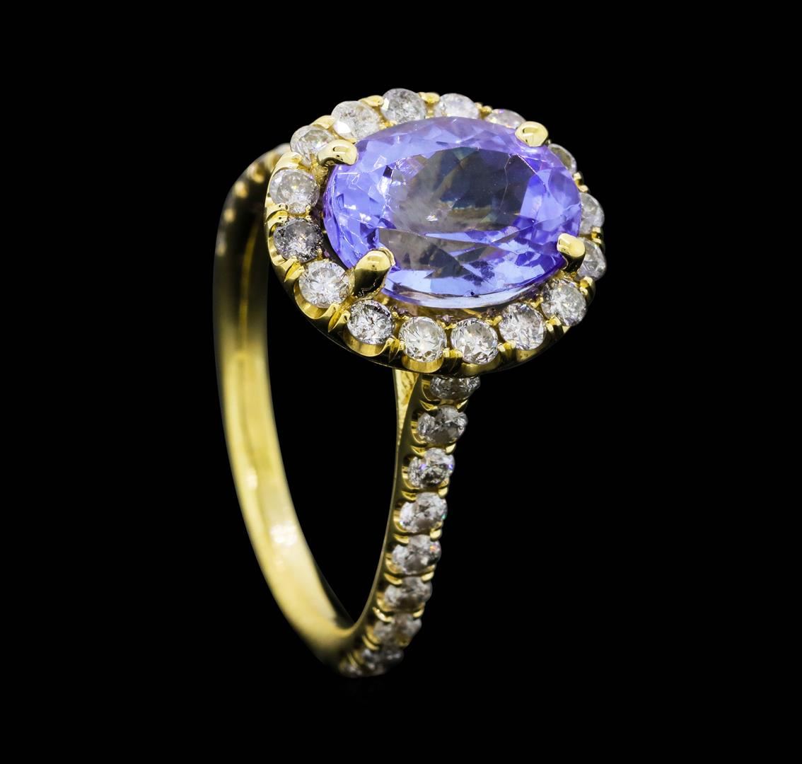 One electronically tested 14KT yellow gold lady's cast fashion ring with a basket halo with a bright polish finish. The featured lady's ring has a shank measuring 2.14 millimeters wide. Identified with markings of "14K". Condition is new, good workmanship. Containing: One prong set oval modified brilliant cut natural tanzanite, measuring 10.35 x 8.00 x 5.60mm, (depth est.) 8%. bulge factor, approximate weight of 3.50ct., clarity is eye clean, medium light, very slightly grayish, violet color, (GIA V 4/3), cut is good. Transmitting light with no distortion, transparent. Colored gemstones are presumed to have been subjected to commonly used enhancement processes. Graded in the setting. Thirty-Four prong set round brilliant cut diamonds, measuring 2.00 - 1.90 x 1.21mm (depth est.) approximate total weight of 34 Stones = 0.95ct. Graded in the setting. Color I - JClarity SI-2 to I-1 Cut Good. Total Weight of Colored Stones 3.50ct. Total Weight of Diamonds 0.95ct. Total Weight of Ring 5.00gm. GAS Appraised.