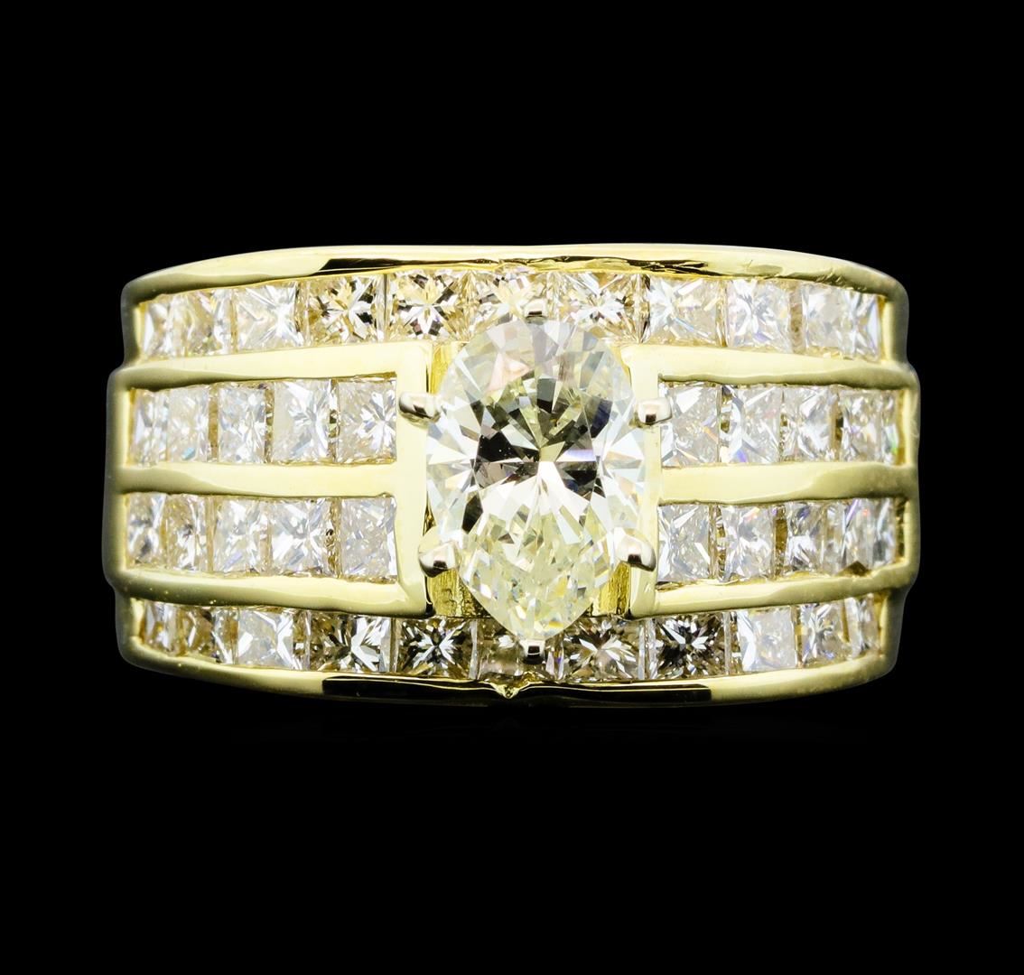 One electronically tested 14KT yellow gold lady's cast wedding ring with a four row tapered shank with a bright polish finish. The featured lady's ring has a shank measuring 6.50 millimeters wide. Identified with markings of "14K". Condition is new, good workmanship. Containing: One prong set pear shaped cut diamond, measuring 8.00 x 5.40 x 3.80mm (depth est.) , 10.00.%. GTCF approximate weight of 1.10ct. Graded in the setting. Clarity: VS-2. Color: L - MCut Very Good Forty-Two channel set princess cut diamonds, measuring 2.40 x 2.00 x 1.50mm (depth est.) approximate total weight of 42 Stones = 2.40ct. Graded in the setting. Clarity: VS-1 to SI-1. Color: H - ICut Good. Total Weight of Diamonds 3.50ct. Total Weight of Ring 11.10gm. GAS Appraised.
