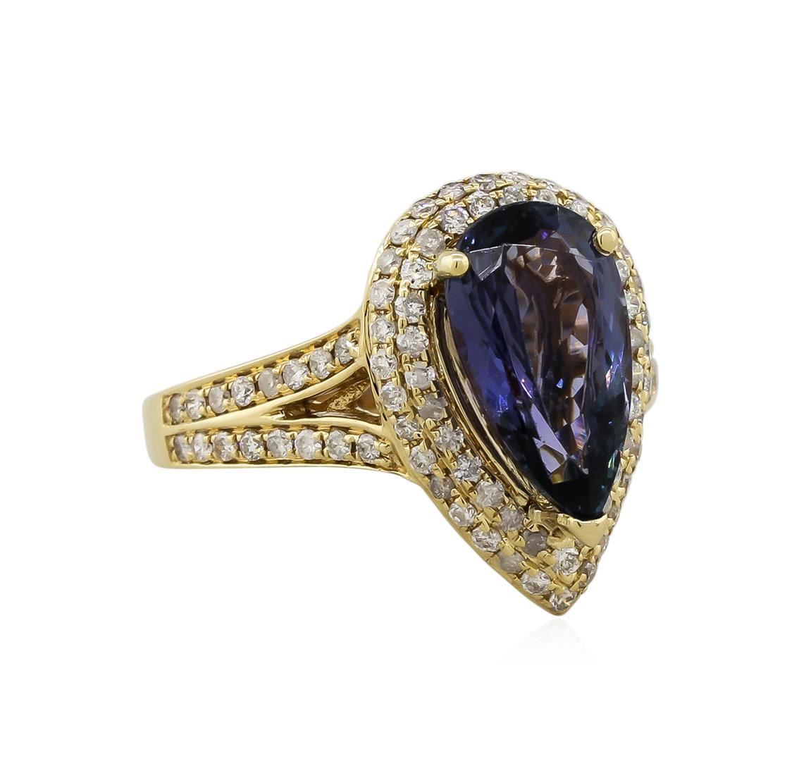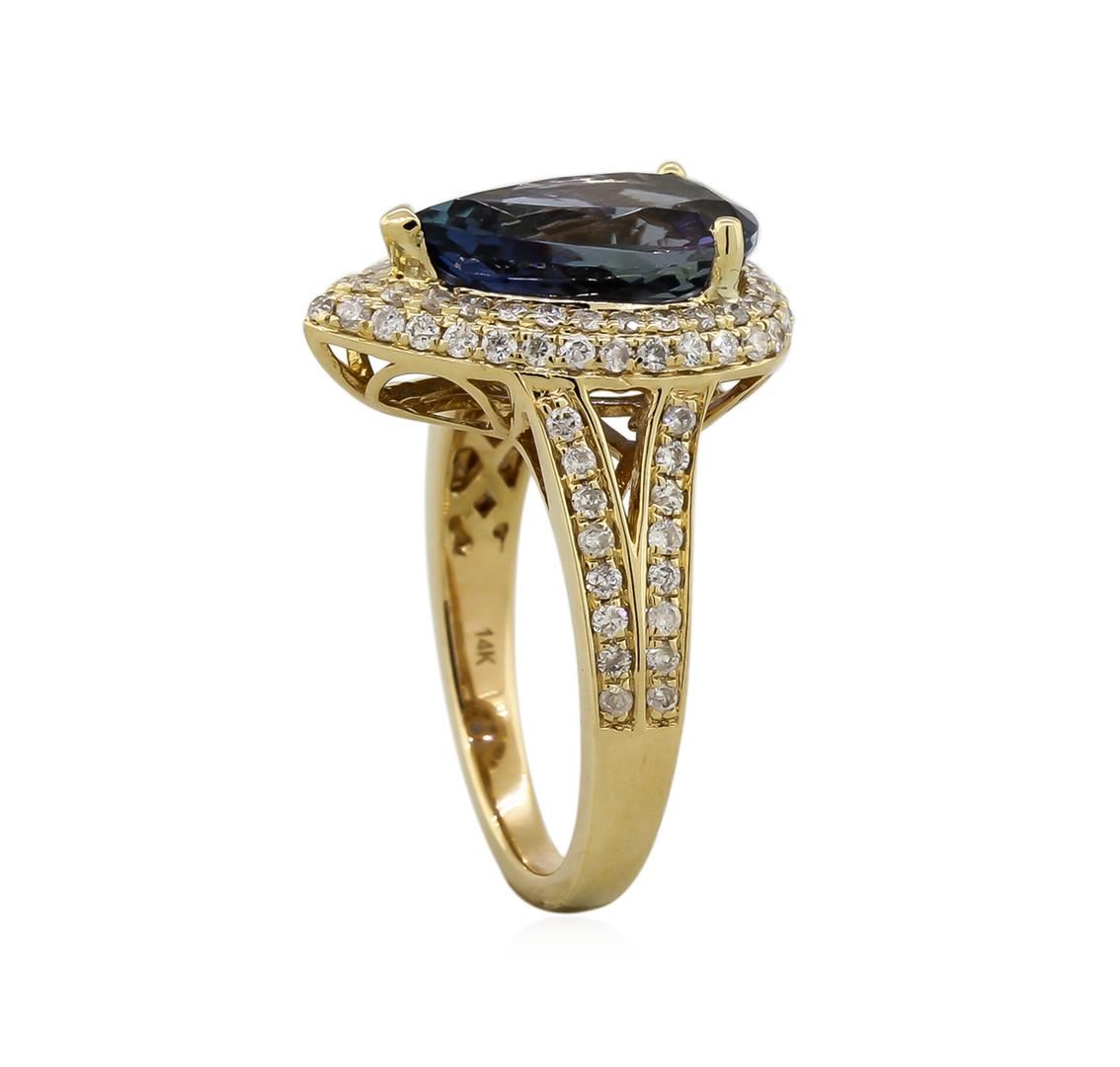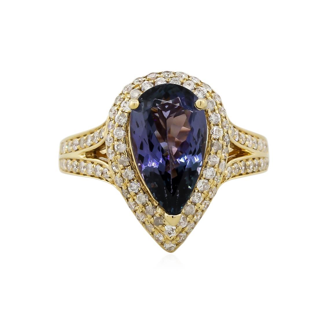 One electronically tested 14KT yellow gold ladies cast tanzanite and diamond ring with a bright polish finish. The featured tanzanite is set within a tiered diamond bezel supported by a lattice under gallery and split diamond shoulders, completed by a two millimeter wide band. Trademark is Orianne. Identified with markings of "14K". Condition is new, good workmanship. Containing: One prong set pear mixed cut natural tanzanite, measuring 13.10 x 7.50 x 4.80mm, 10%. bulge factor, approximate weight of 3.60ct., clarity is eye clean, type I, dark, very slightly grayish, violetish blue color, (GIA vB 7/3), cut is good. Transmitting lightwith no distortion, transparent. Graded in the setting.Tanzanite is a very rare gemstone that is only found in the country of Tanzania. Originally discovered in 1967. Tiffany & Company, named the stone Tanzanite. It is found in the Usumburu Mountains that border the Umba Valley of northern Tanzania. Tanzanite occurs in gray, brown, violet, blue, reddish-purple, & green. The gem is interesting because of its exceptional pleochroism. Rotated in different directions a tanzanite will exhibit multiple changes of color. Tanzanite has a low tolerance to ultrasonic cleaning, and should not be cleaned using this method.Ninety-One prong set round brilliant cut diamonds approximate. Total Weight of 91 Stones = 0.75ct. Graded in the setting. Clarity: SI-3. Color: G - I. Total Weight of Colored Stones 3.60ct. Total Weight of Diamonds 0.75ct. Total Weight of Ring 6.16gm. AIG Appraised at $10,840.00.