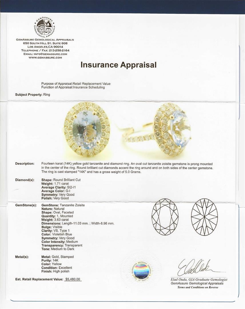 Fourteen karat (14K) yellow gold tanzanite and diamond ring. An Oval Cut tanzanite zoisite gemstone, weighing approximately 3.63cts, is prong mounted in the center of the ring. Round brilliant cut diamonds, weighing approximately 1.71ctw with an average clarity of SI2-I1 and a color of G-I, accent the ring around and on both sides of the center gemstone. The ring is cast stamped "14K" and has a gross weight of 5.0 Grams. GGA Appraised at $5,480.00.