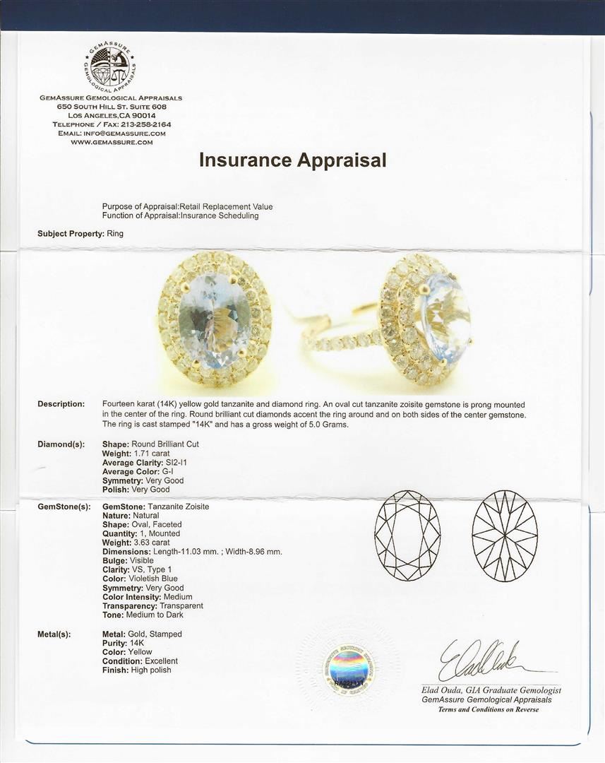 Fourteen karat (14K) yellow gold tanzanite and diamond ring. An Oval Cut tanzanite zoisite gemstone, weighing approximately 3.63cts, is prong mounted in the center of the ring. Round brilliant cut diamonds, weighing approximately 1.71ctw with an average clarity of SI2-I1 and a color of G-I, accent the ring around and on both sides of the center gemstone. The ring is cast stamped "14K" and has a gross weight of 5.0 Grams. GGA Appraised.