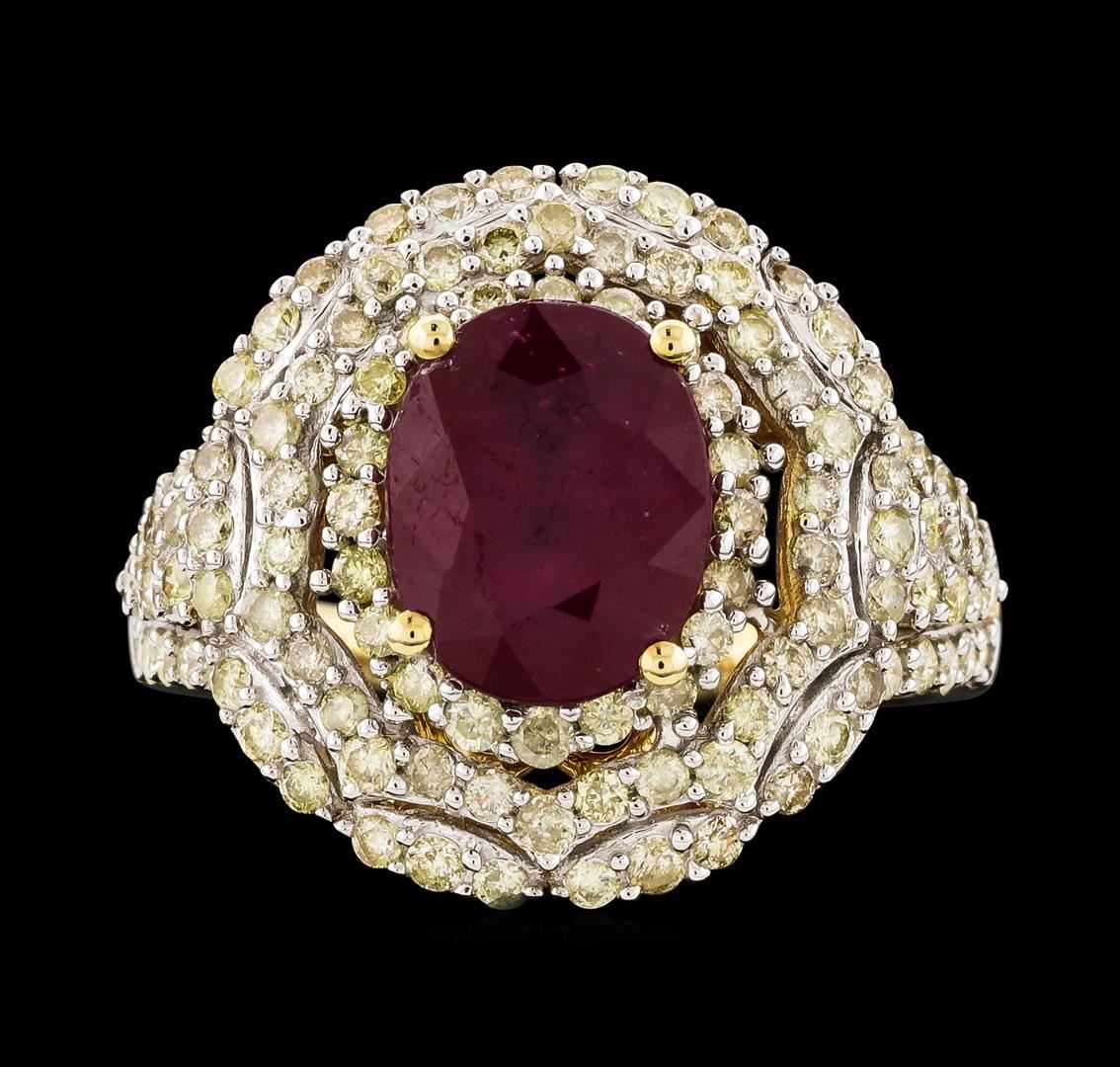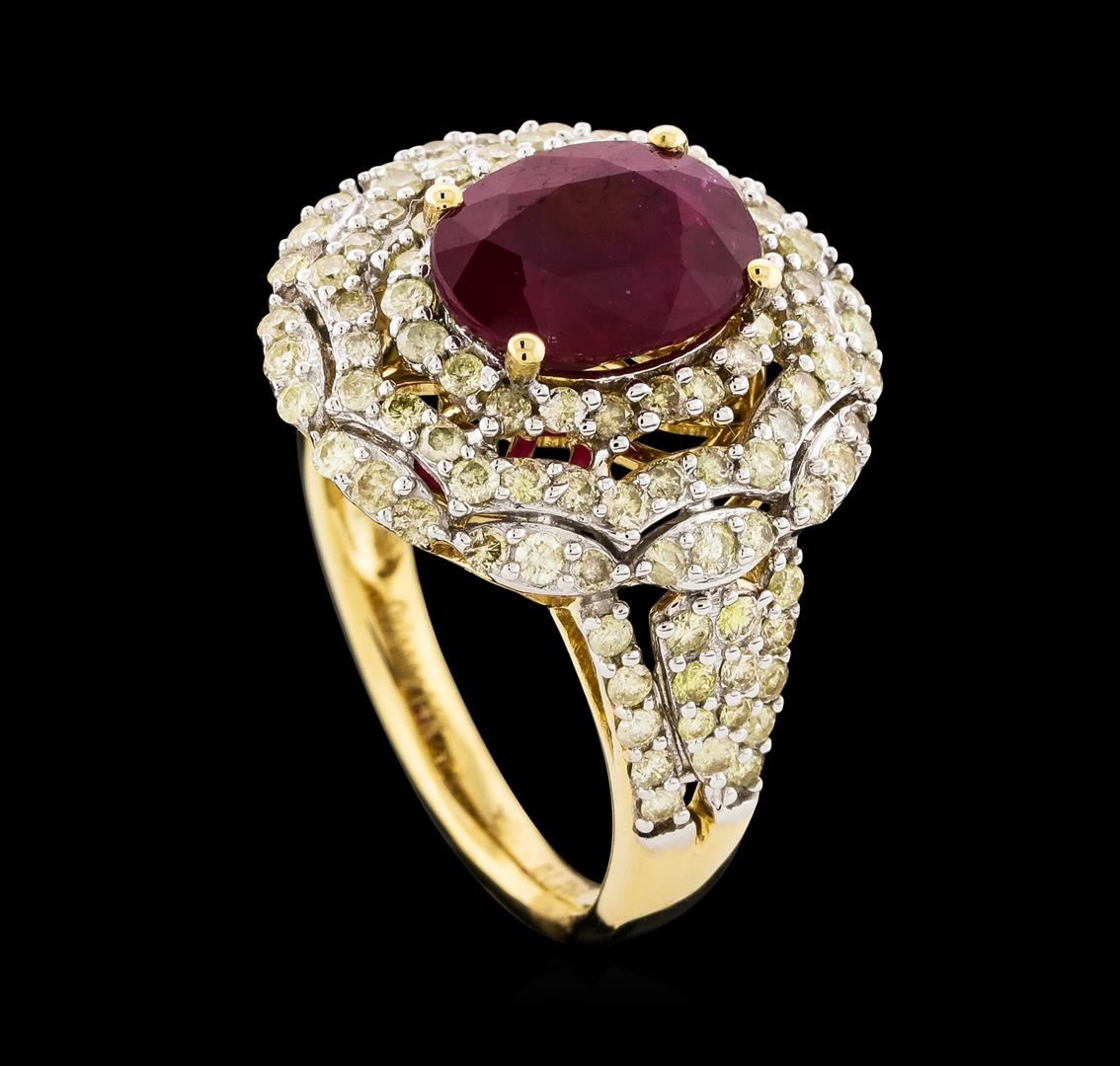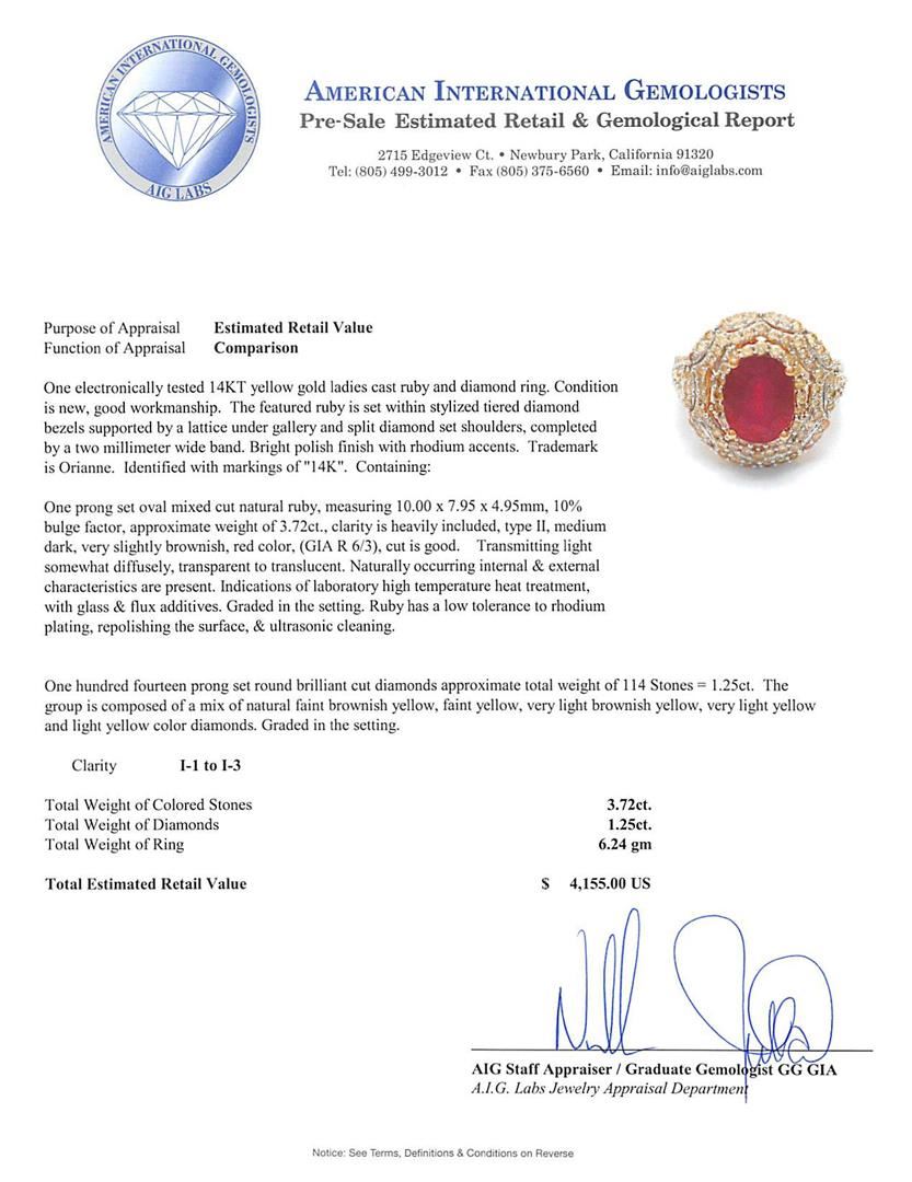 One electronically tested 14KT yellow gold ladies cast ruby and diamond ring. The featured ruby is set within stylized tiered diamond bezels supported by a lattice under gallery and split diamond set shoulders, completed by a two millimeter wide band. Bright polish finish with rhodium accents. Trademark is Orianne. Identified with markings of "14K". Condition is new, good workmanship. Containing: One prong set oval mixed cut natural ruby, measuring 10.00 x 7.95 x 4.95mm, 10%. bulge factor, approximate weight of 3.72ct., clarity is heavily included, type II, medium dark, very slightly brownish, red color, (GIA R 6/3), cut is good. Transmitting light somewhat diffusely, transparent to translucent. Naturally occurring internal & external characteristics are present. Indications of laboratory high temperature heat treatment, with glass & flux additives. Graded in the setting. Ruby has a low tolerance to rhodium plating, repolishing the surface, & ultrasonic cleaning. One Hundred Fourteen prong set round brilliant cut diamonds approximate total weight of 114 Stones = 1.25ct. The group is composed of a mix of natural faint brownish yellow, faint yellow, very light brownish yellow, very light yellow and light yellow color diamonds. Graded in the setting. Clarity: I-1 to I-3. Total Weight of Colored Stones 3.72ct. Total Weight of Diamonds 1.25ct. Total Weight of Ring 6.24gm. AIG Appraised at $4,155.00.