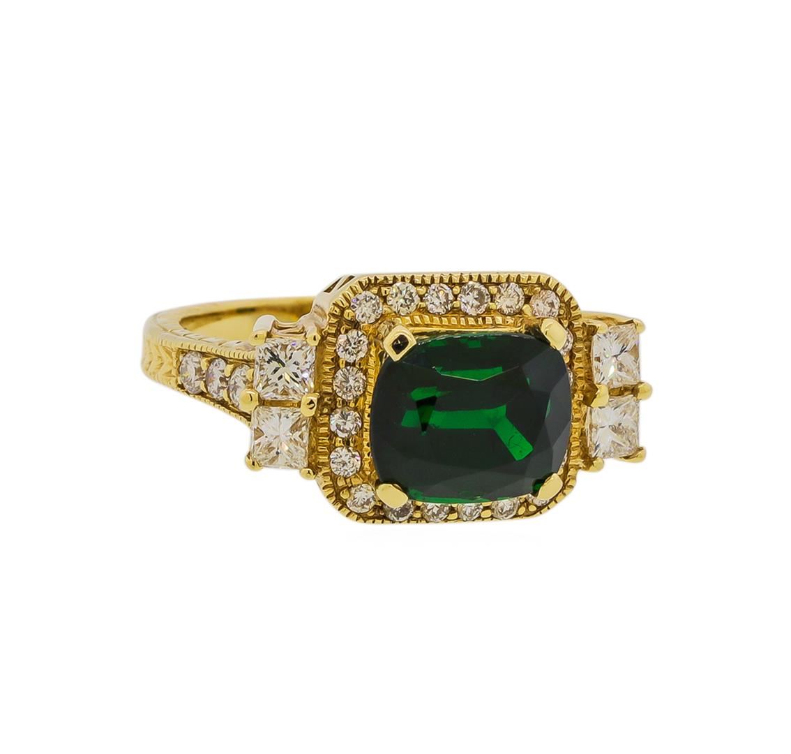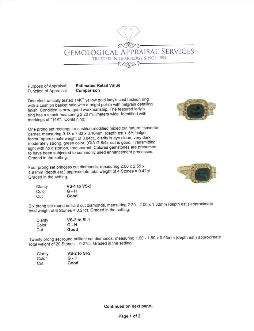 One electronically tested 14KT yellow gold lady's cast fashion ring with a cushion basket halo with a bright polish with milgrain detailing finish. The featured lady's ring has a shank measuring 2.20 millimeters wide. Identified with markings of "14K". Condition is new, good workmanship. Containing: One prong set rectangular cushion modified mixed cut natural tsavorite garnet, measuring 9.18 x 7.62 x 6.16mm, (depth est.) 5%. bulge factor, approximate weight of 3.84ct., clarity is eye clean, very dark, moderately strong, green color, (GIA G 8/4), cut is good. Transmitting light with no distortion, transparent. Colored gemstones are presumed to have been subjected to commonly used enhancement processes. Graded in the setting.Four prong set princess cut diamonds, measuring 2.60 x 2.55 x 1.91mm (depth est.) approximate total weight of 4 Stones = 0.42ct. Graded in the setting. Clarity: VS-1 to VS-2. Color: G - HCut Good Six prong set round brilliant cut diamonds, measuring 2.20 - 2.00 x 1.30mm (depth est.) approximate total weight of 6 Stones = 0.21ct. Graded in the setting. Clarity: VS-2 to SI-1. Color: G - HCut Good Twenty prong set round brilliant cut diamonds, measuring 1.60 - 1.50 x 0.93mm (depth est.) approximate total weight of 20 Stones = 0.27ct. Graded in the setting. Clarity: VS-2 to SI-2. Color: G - HCut Good. Total Weight of Colored Stones 3.84ct. Total Weight of Diamonds 0.90ct. Total Weight of Ring 5.60gm. GAS Appraised.