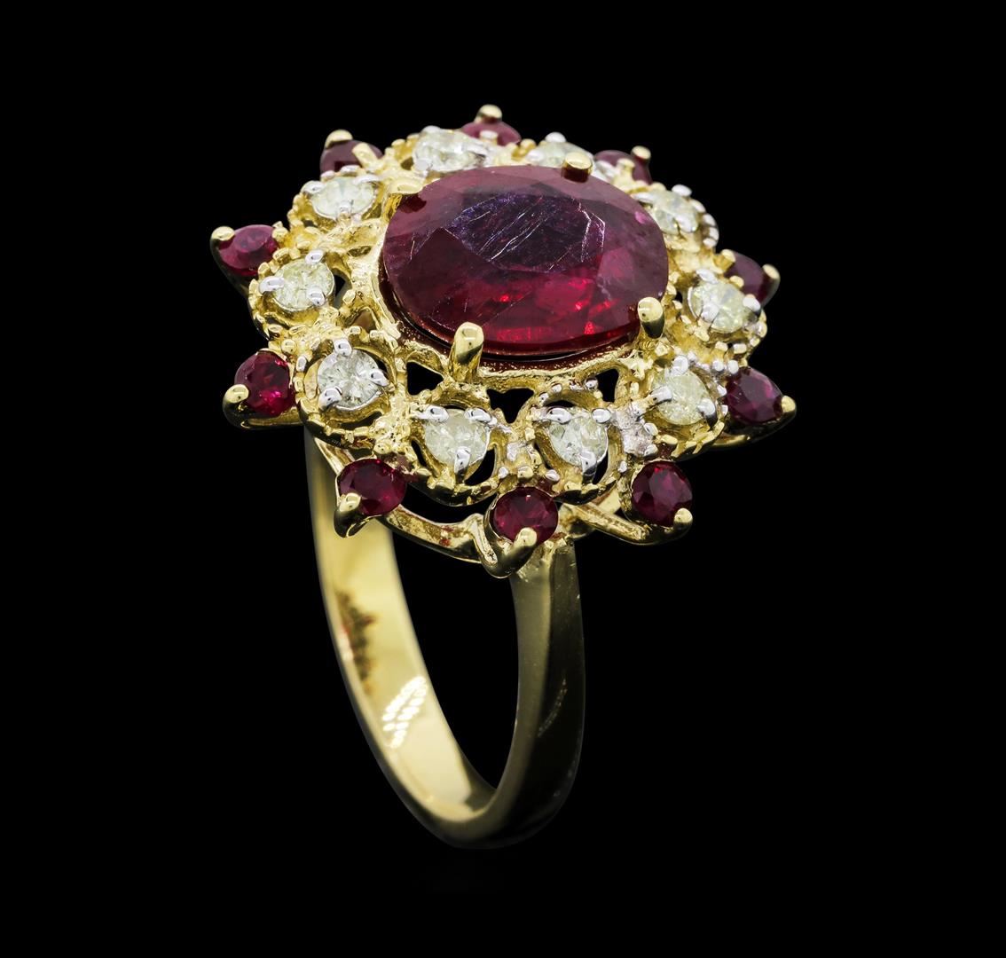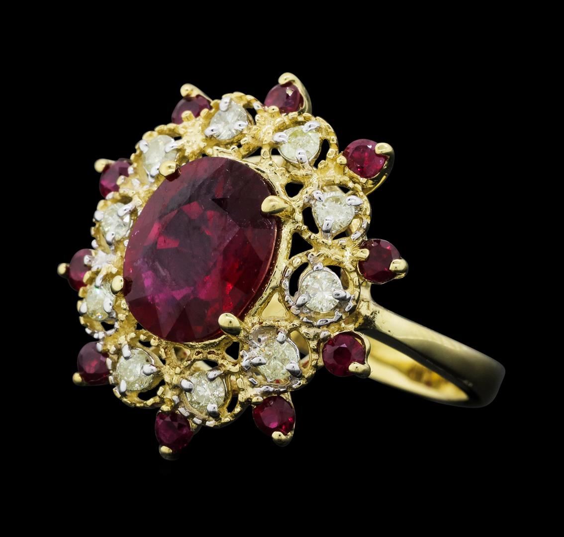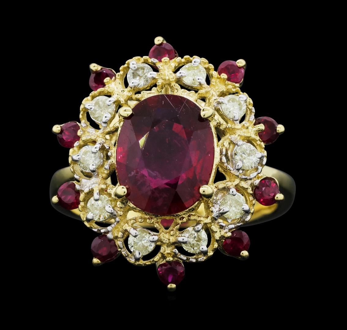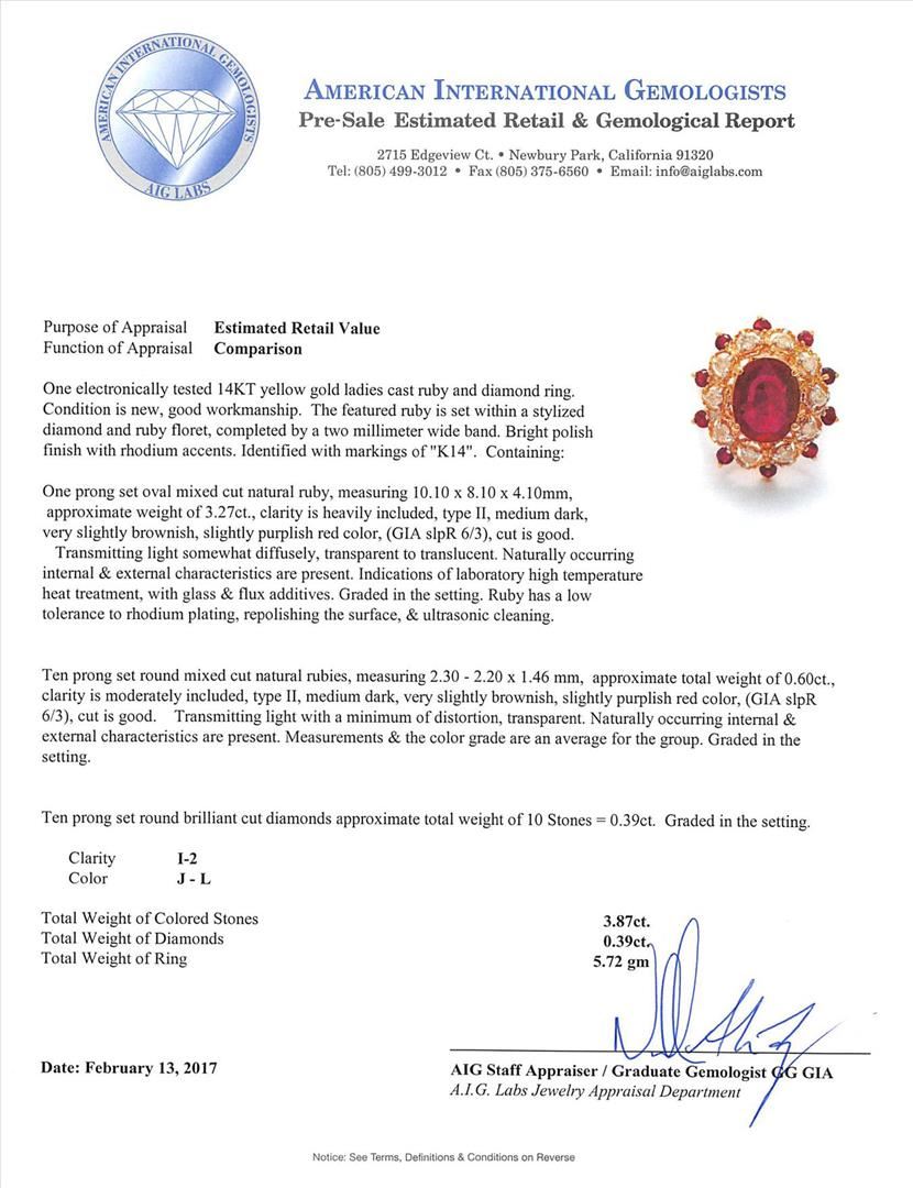 One electronically tested 14KT yellow gold ladies cast ruby and diamond ring. The featured ruby is set within a stylized diamond and ruby floret, completed by a two millimeter wide band. Bright polish finish with rhodium accents. Identified with markings of "K14". Condition is new, good workmanship. Containing: One prong set oval mixed cut natural ruby, measuring 10.10 x 8.10 x 4.10mm, approximate weight of 3.27ct., clarity is heavily included, type II, medium dark, very slightly brownish, slightly purplish red color, (GIA slpR 6/3), cut is good. Transmitting light somewhat diffusely, transparent to translucent. Naturally occurring internal & external characteristics are present. Indications of laboratory high temperature heat treatment, with glass & flux additives. Graded in the setting. Ruby has a low tolerance to rhodium plating, repolishing the surface, & ultrasonic cleaning.Ten prong set round mixed cut natural rubies, measuring 2.30 - 2.20 x 1.46 mm, approximate total weight of 0.60ct., clarity is moderately included, type II, medium dark, very slightly brownish, slightly purplish red color, (GIA slpR 6/3), cut is good. Transmitting light with a minimum of distortion, transparent. Naturally occurring internal & external characteristics are present. Measurements & the color grade are an average for the group. Graded in the setting.Ten prong set round brilliant cut diamonds approximate total weight of 10 Stones = 0.39ct. Graded in the setting. Clarity: I-2. Color: J - L. Total Weight of Colored Stones 3.87ct. Total Weight of Diamonds 0.39ct. Total Weight of Ring 5.72gm. AIG Appraised.
