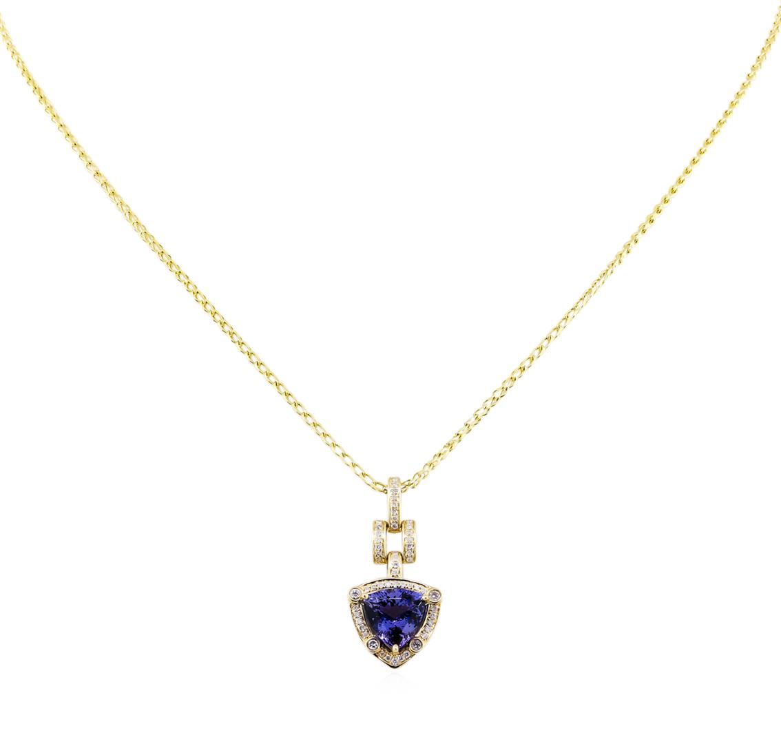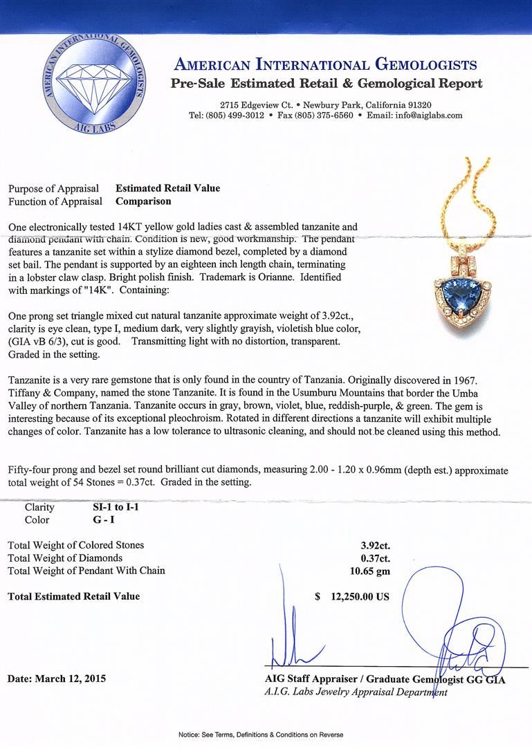 One electronically tested 14KT yellow gold ladies cast & assembled tanzanite and diamond pendant with chain. The pendant features a tanzanite set within a stylize diamond bezel, completed by a diamond set bail. The pendant is supported by an eighteen inch length chain, terminating in a lobster claw clasp. Bright polish finish. Trademark is Orianne. Identified with markings of "14K". Condition is new, good workmanship. Containing: One prong set triangle mixed cut natural tanzanite approximate weight of 3.92ct., clarity is eye clean, type I, medium dark, very slightly grayish, violetish blue color, (GIA vB 6/3), cut is good. Transmitting light with no distortion, transparent. Graded in the setting.Tanzanite is a very rare gemstone that is only found in the country of Tanzania. Originally discovered in 1967. Tiffany & Company, named the stone Tanzanite. It is found in the Usumburu Mountains that border the Umba Valley of northern Tanzania. Tanzanite occurs in gray, brown, violet, blue, reddish-purple, & green. The gem is interesting because of its exceptional pleochroism. Rotated in different directions a tanzanite will exhibit multiple changes of color. Tanzanite has a low tolerance to ultrasonic cleaning, and should not be cleaned using this method.Fifty-Four prong and bezel set round brilliant cut diamonds, measuring 2.00 - 1.20 x 0.96mm (depth est.) approximate. Total Weight of 54 Stones = 0.37ct. Graded in the setting. Clarity: SI-1 to I-1. Color: G - I. Total Weight of Colored Stones 3.92ct. Total Weight of Diamonds 0.37ct. AIG Appraised at $12,250.00.