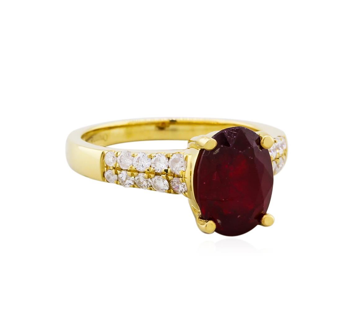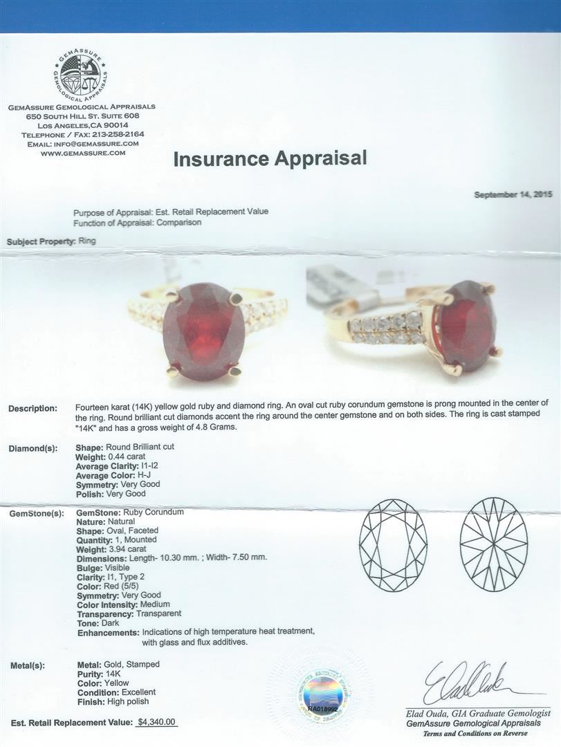 14KT yellow gold ruby and diamond ring. An oval cut ruby corundum gemstone weighing in at an aproximate 3.94 carats is prong mounted in the center of the ring. Approximately 0.44 carats of round brilliant cut diamonds accent the ring around the center gemstones and on both sides. The ring is cast stamped "14K" and has a gross weight of 4.8 grams. Finish: High polish. Condition: Excellent GGA Appraised at $4,340.00.