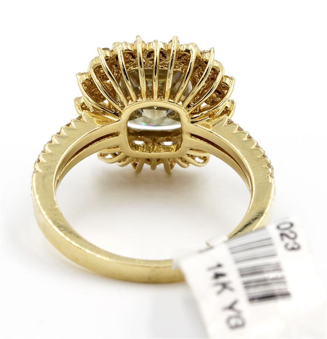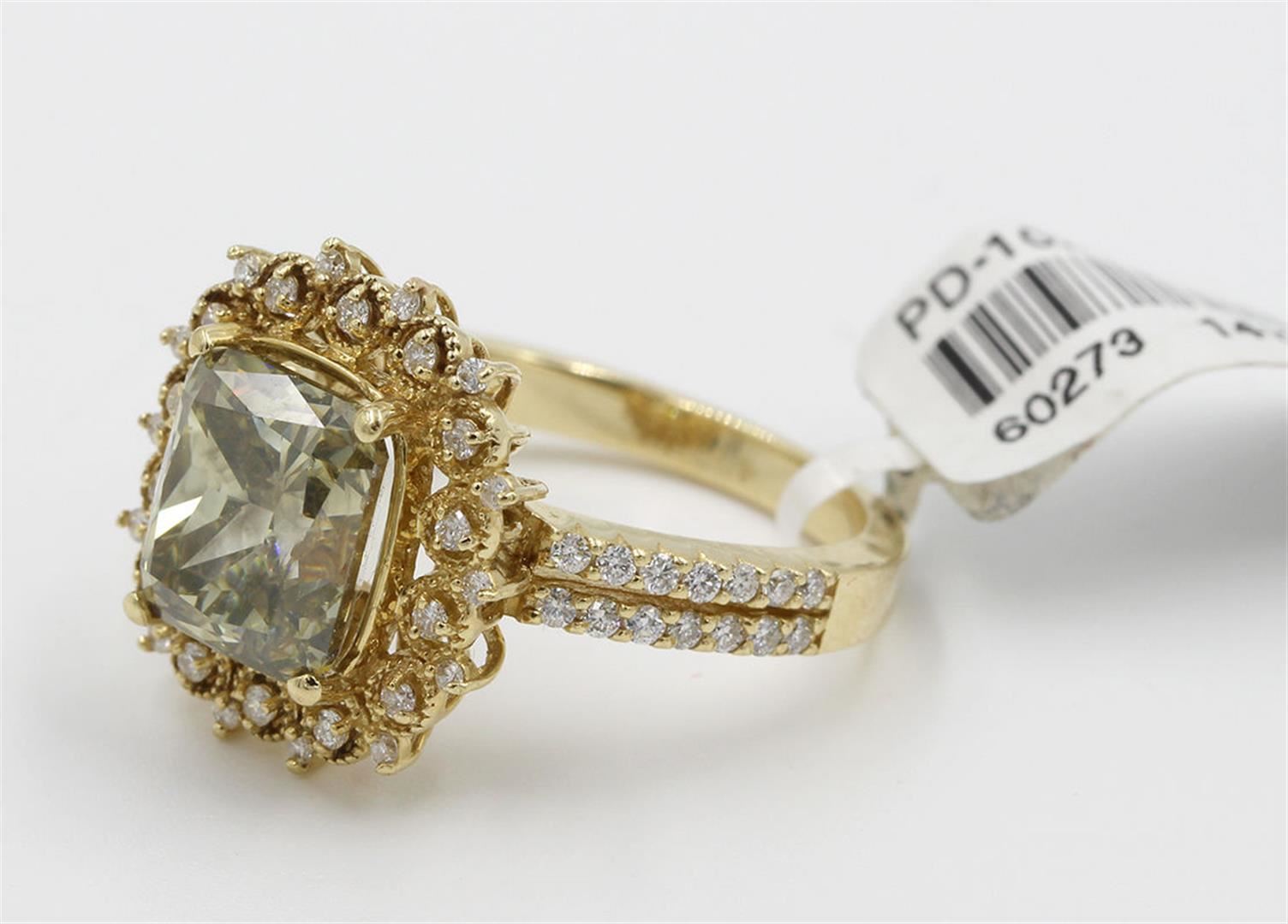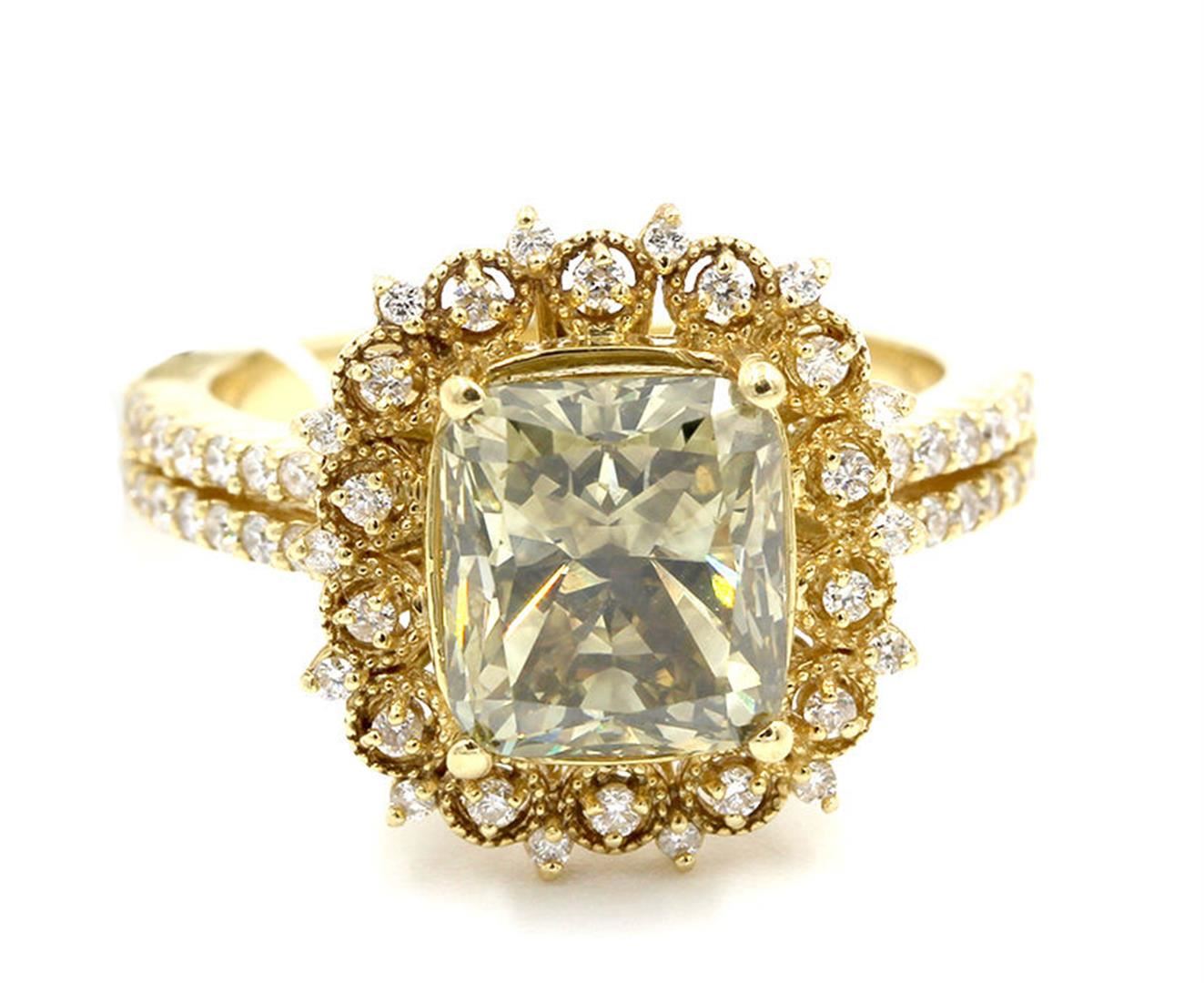 One Natural Fancy Green (VS) Diamond Engagement Anniversary Ring in 14k yellow gold. Ring design is unique vintage fashion with split shank. Prong setting is v-prong. Ring size is 6.50 but is resizable. Total gram weight is 5.38g, carat weight 3.98 ct. Main diamond is not enhanced and natural and the shape is cushion. Main diamond is 3.62 carats, clarity SI-1, color is light fancy green, and with an excellent cut. Side stone is not enhanced and natural. Side diamonds equate a total 0.36 carats, color G, clarity SI-1, shape is round cut, and cut is excellent. There is a total of 56 side diamonds.