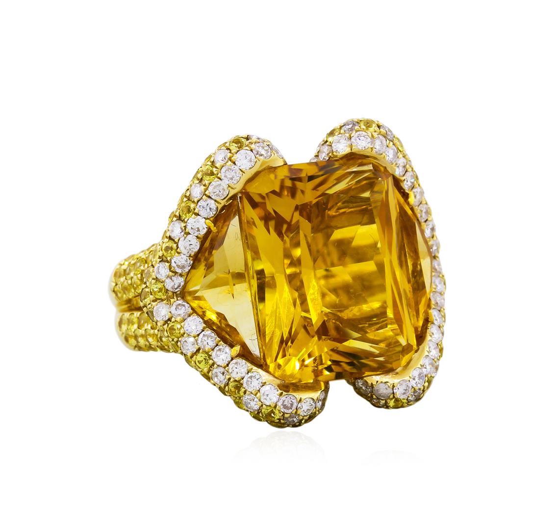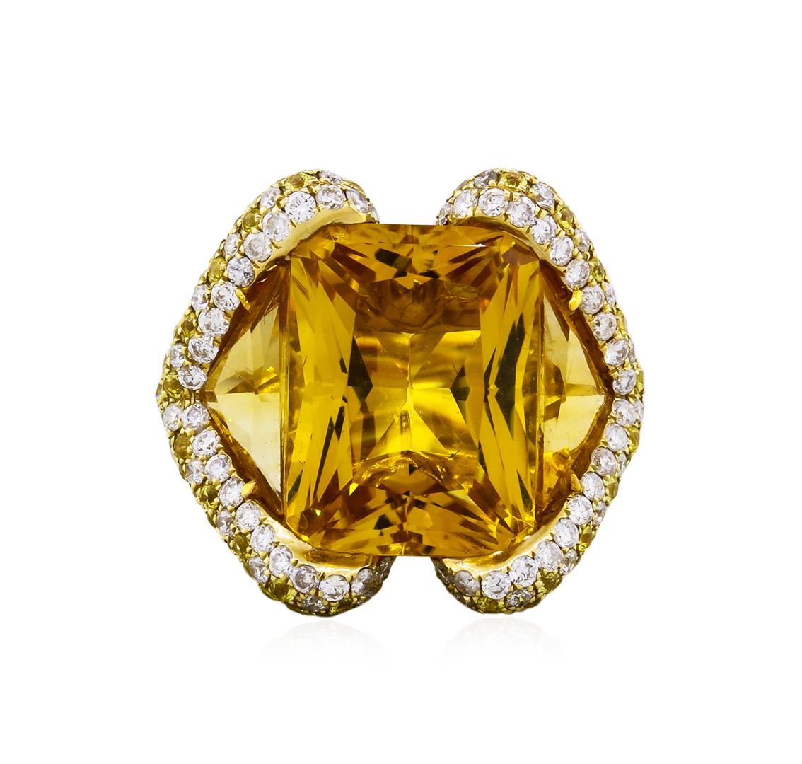One citrine and diamond ring set in 14KT yellow gold weighing 4.60 grams. This gorgeous ring contains a total weight of 34.70 carats of citrine gemstones including the three center-stones as well as the round cut citrine gemstones displayed alongside 0.19 carats of round diamonds.