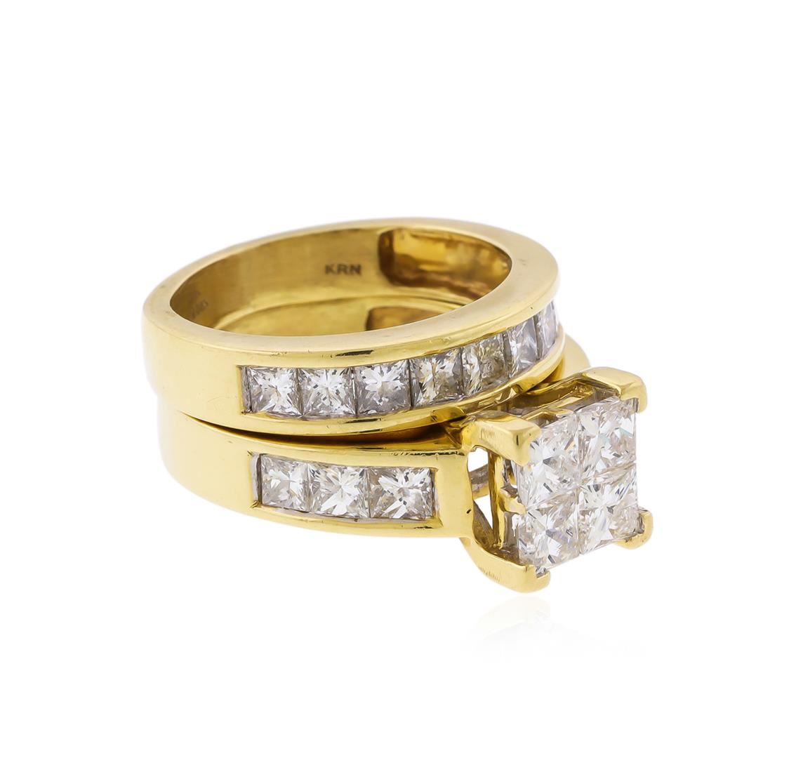 Fourteen karat (14K) yellow gold two piece princess cut diamond ring. Four (4) princess cut diamonds are mounted in the center of the ring. Princess cut diamonds accent the ring and its matching band an both sides of the center diamonds. Approximate Total Diamond weight is 4.00ctw .The rings are cast stamped 14K and have a gross weight of 9.1 Grams. GGA Appraised at $6,280.00.