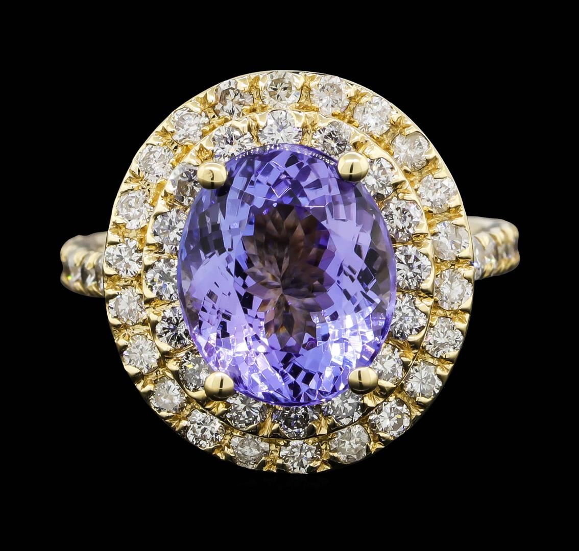 One electronically tested 14KT yellow gold lady's cast fashion ring with a basket double halo with a bright polish finish. The featured lady's ring has a shank measuring 1.92 millimeters wide. Identified with markings of "14K". Condition is new, good workmanship. Containing: One prong set oval modified brilliant cut natural tanzanite, measuring 10.90 x 9.05 x 5.50mm, (depth est.) 5%. bulge factor, approximate weight of 4.09ct., clarity is eye clean, medium light, very slightly grayish, violet color, (GIA V 4/3), cut is very good. Transmitting light with no distortion, transparent. Colored gemstones are presumed to have been subjected to commonly used enhancement processes. Graded in the setting. Fifty-Six prong set round brilliant cut diamonds, measuring 1.90 - 1.80 x 1.13mm (depth est.) approximate total weight of 56 Stones = 1.32ct. Graded in the setting. Clarity: SI-1 to I-1. Color: G - ICut Good. Total Weight of Colored Stones 4.09ct. Total Weight of Diamonds 1.32ct. Total Weight of Ring 5.80gm. GAS Appraised.