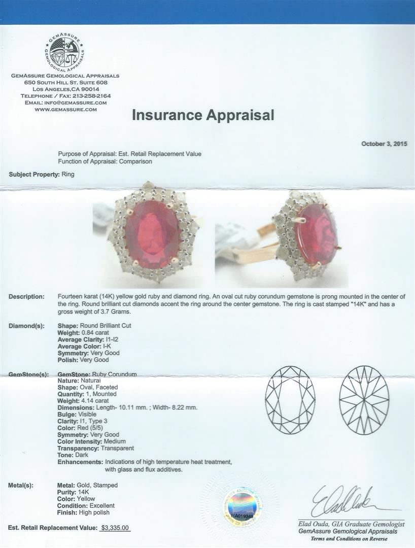 14KT yellow gold ruby and diamond ring. An oval cut ruby corundum gemstone weighing in at an aproximate 4.14 carats is prong mounted in the center of the ring. Approximately 0.84 carats of round brilliant cut diamonds accent the ring around the center gemstones and create a beautiful ornate design. The ring is cast stamped "14K" and has a gross weight of 3.7 grams. Finish: High polish. Condition: Excellent GGA Appraised at $3,335.00.