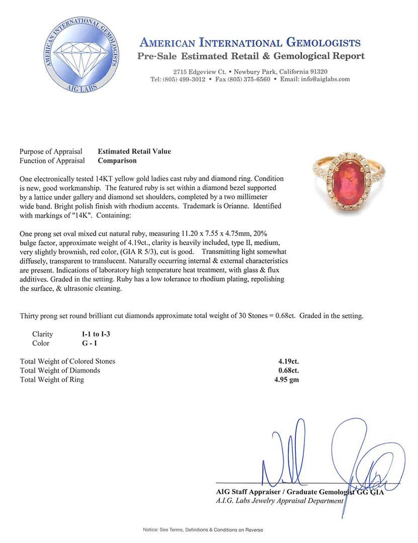 One electronically tested 14KT yellow gold ladies cast ruby and diamond ring. The featured ruby is set within a diamond bezel supported by a lattice under gallery and diamond set shoulders, completed by a two millimeter wide band. Bright polish finish with rhodium accents. Trademark is Orianne. Identified with markings of "14K". Condition is new, good workmanship. Containing: One prong set oval mixed cut natural ruby, measuring 11.20 x 7.55 x 4.75mm, 20%. bulge factor, approximate weight of 4.19ct., clarity is heavily included, type II, medium, very slightly brownish, red color, (GIA R 5/3), cut is good. Transmitting light somewhat diffusely, transparent to translucent. Naturally occurring internal & external characteristics are present. Indications of laboratory high temperature heat treatment, with glass & flux additives. Graded in the setting. Ruby has a low tolerance to rhodium plating, repolishing the surface, & ultrasonic cleaning. Thirty prong set round brilliant cut diamonds approximate total weight of 30 Stones = 0.68ct. Graded in the setting. Clarity: I-1 to I-3. Color: G - I. Total Weight of Colored Stones 4.19ct. Total Weight of Diamonds 0.68ct. Total Weight of Ring 4.95gm. AIG Appraised.