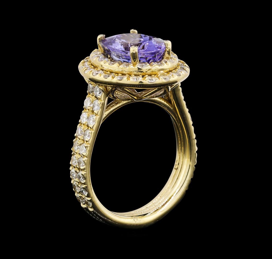One electronically tested 14KT yellow gold lady's cast fashion ring with a double shank double basket halo with a bright polish finish. The featured lady's ring has a double shank measuring 4.05 millimeters wide. Identified with markings of "14K". Condition is new, good workmanship. Containing: One prong set oval modified brilliant cut natural tanzanite, measuring 11.00 x 8.75 x 6.84mm, (depth est.) approximate weight of 4.20ct., clarity is eye clean, medium light, very slightly grayish, violet color, (GIA V 4/3), cut is very good. Transmitting light with no distortion, transparent. Colored gemstones are presumed to have been subjected to commonly used enhancement processes. Graded in the setting. Seventy-Four prong set round brilliant cut diamonds, measuring 1.90 - 1.80 x 1.13mm (depth est.) approximate total weight of 74 Stones = 1.76ct. Graded in the setting. Clarity: SI-2 to I-1. Color: H - JCut Good. Total Weight of Colored Stones 4.20ct. Total Weight of Diamonds 1.76ct. Total Weight of Ring 8.10gm. GAS Appraised.
