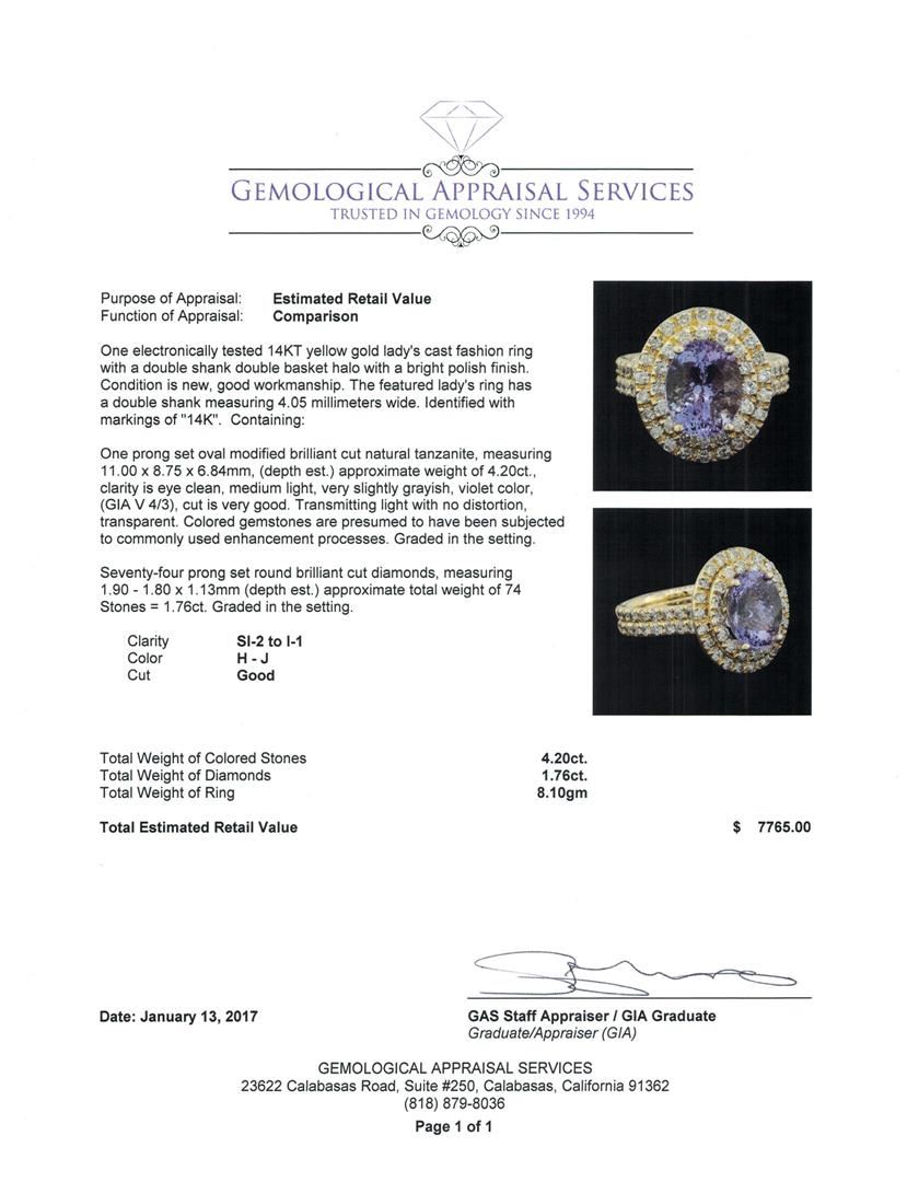 One electronically tested 14KT yellow gold lady's cast fashion ring with a double shank double basket halo with a bright polish finish. The featured lady's ring has a double shank measuring 4.05 millimeters wide. Identified with markings of "14K". Condition is new, good workmanship. Containing: One prong set oval modified brilliant cut natural tanzanite, measuring 11.00 x 8.75 x 6.84mm, (depth est.) approximate weight of 4.20ct., clarity is eye clean, medium light, very slightly grayish, violet color, (GIA V 4/3), cut is very good. Transmitting light with no distortion, transparent. Colored gemstones are presumed to have been subjected to commonly used enhancement processes. Graded in the setting. Seventy-Four prong set round brilliant cut diamonds, measuring 1.90 - 1.80 x 1.13mm (depth est.) approximate total weight of 74 Stones = 1.76ct. Graded in the setting. Clarity: SI-2 to I-1. Color: H - JCut Good. Total Weight of Colored Stones 4.20ct. Total Weight of Diamonds 1.76ct. Total Weight of Ring 8.10gm. GAS Appraised at $7,765.00.