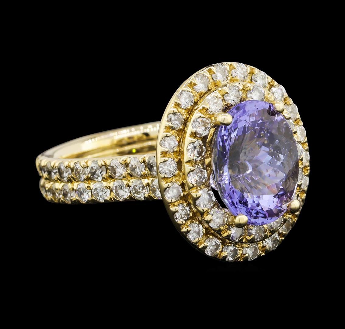 One electronically tested 14KT yellow gold lady's cast fashion ring with a double shank double basket halo with a bright polish finish. The featured lady's ring has a double shank measuring 4.05 millimeters wide. Identified with markings of "14K". Condition is new, good workmanship. Containing: One prong set oval modified brilliant cut natural tanzanite, measuring 11.00 x 8.75 x 6.84mm, (depth est.) approximate weight of 4.20ct., clarity is eye clean, medium light, very slightly grayish, violet color, (GIA V 4/3), cut is very good. Transmitting light with no distortion, transparent. Colored gemstones are presumed to have been subjected to commonly used enhancement processes. Graded in the setting. Seventy-Four prong set round brilliant cut diamonds, measuring 1.90 - 1.80 x 1.13mm (depth est.) approximate total weight of 74 Stones = 1.76ct. Graded in the setting. Clarity: SI-2 to I-1. Color: H - JCut Good. Total Weight of Colored Stones 4.20ct. Total Weight of Diamonds 1.76ct. Total Weight of Ring 8.10gm. GAS Appraised.