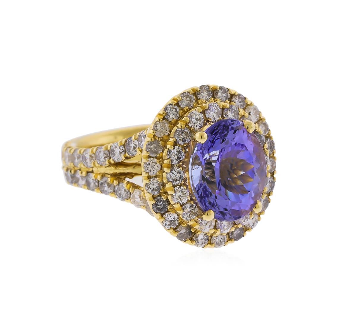 Fourteen karat (14K) gold Tanzanite and diamond ring. An oval cut tanzanite zoisite gemstone, weighing approximately 4.23cts, is prong mounted in the center of the ring. Round brilliant cut diamonds, weighing approximately 1.86ctw with an average clarity of SI-2 to I1 and an average color of G-I, accent the ring around and on both sides of the center gemstone. The ring is cast stamped 14K and has a gross weight of 8.5 Grams. GGA Appraised.