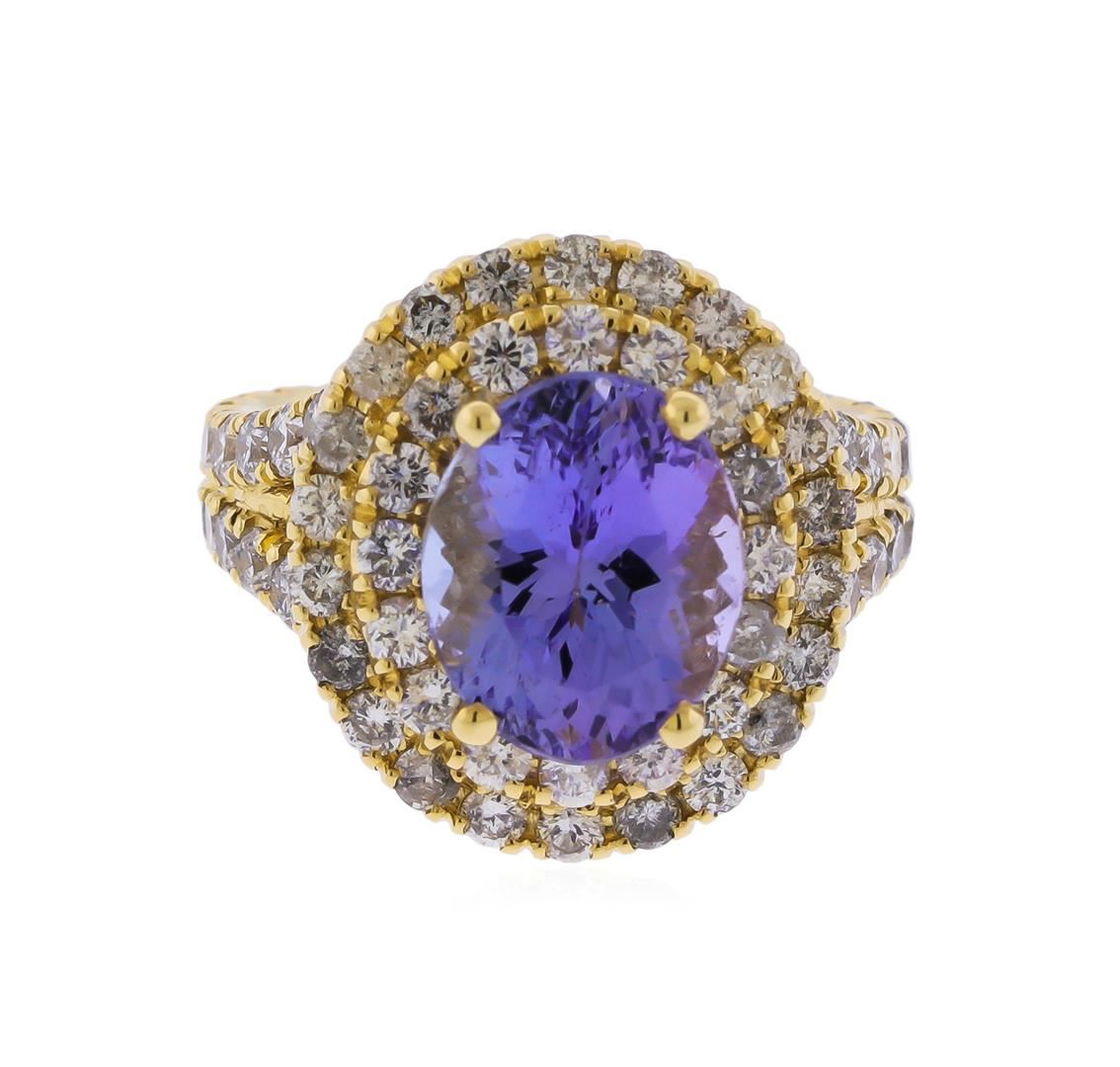 Fourteen karat (14K) gold Tanzanite and diamond ring. An oval cut tanzanite zoisite gemstone, weighing approximately 4.23cts, is prong mounted in the center of the ring. Round brilliant cut diamonds, weighing approximately 1.86ctw with an average clarity of SI-2 to I1 and an average color of G-I, accent the ring around and on both sides of the center gemstone. The ring is cast stamped 14K and has a gross weight of 8.5 Grams. GGA Appraised.