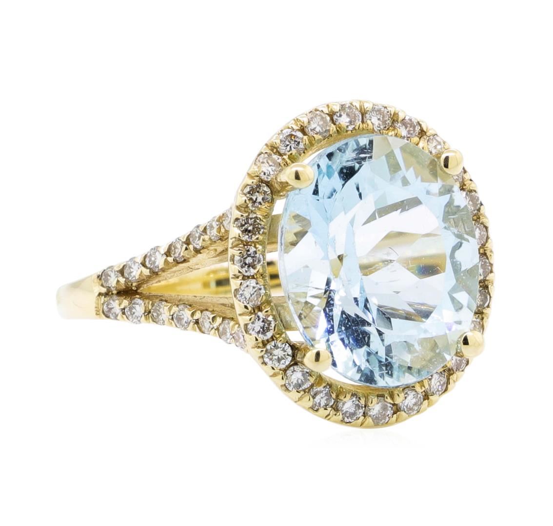One electronically tested 14KT yellow gold Ladies cast fashion ring with a split shank halo with a bright polish finish. The featured Ladies ring has a shank measuring 1.80 millimeters wide. Identified with markings of '14K'. Condition is new, good workmanship. Containing: One prong set oval modified mixed cut natural aquamarine, measuring 12.02 x 10.14 x 7.08mm, (depth est.) approximate weight of 4.37ct., clarity is slightly included, medium light, moderately strong, greenish blue color, (GIA gB 4/4), cut is very good. Transmitting light with a minimum of distortion, transparent. Colored gemstones are presumed to have been subjected to commonly used enhancement processes. Graded in the setting. Fifty-Four prong set round brilliant cut diamonds, measuring 1.40 - 1.30 x 0.84mm (depth est.) approximate total weight of 54 Stones = 0.50ct. Graded in the setting. Color H - I Clarity SI-1 to I-1 Cut Good. Total Weight of Colored Stones 4.37ct.. Total Weight of Diamonds 0.50ct.. Total Weight of Ring 4.50gm. GAS Appraised.