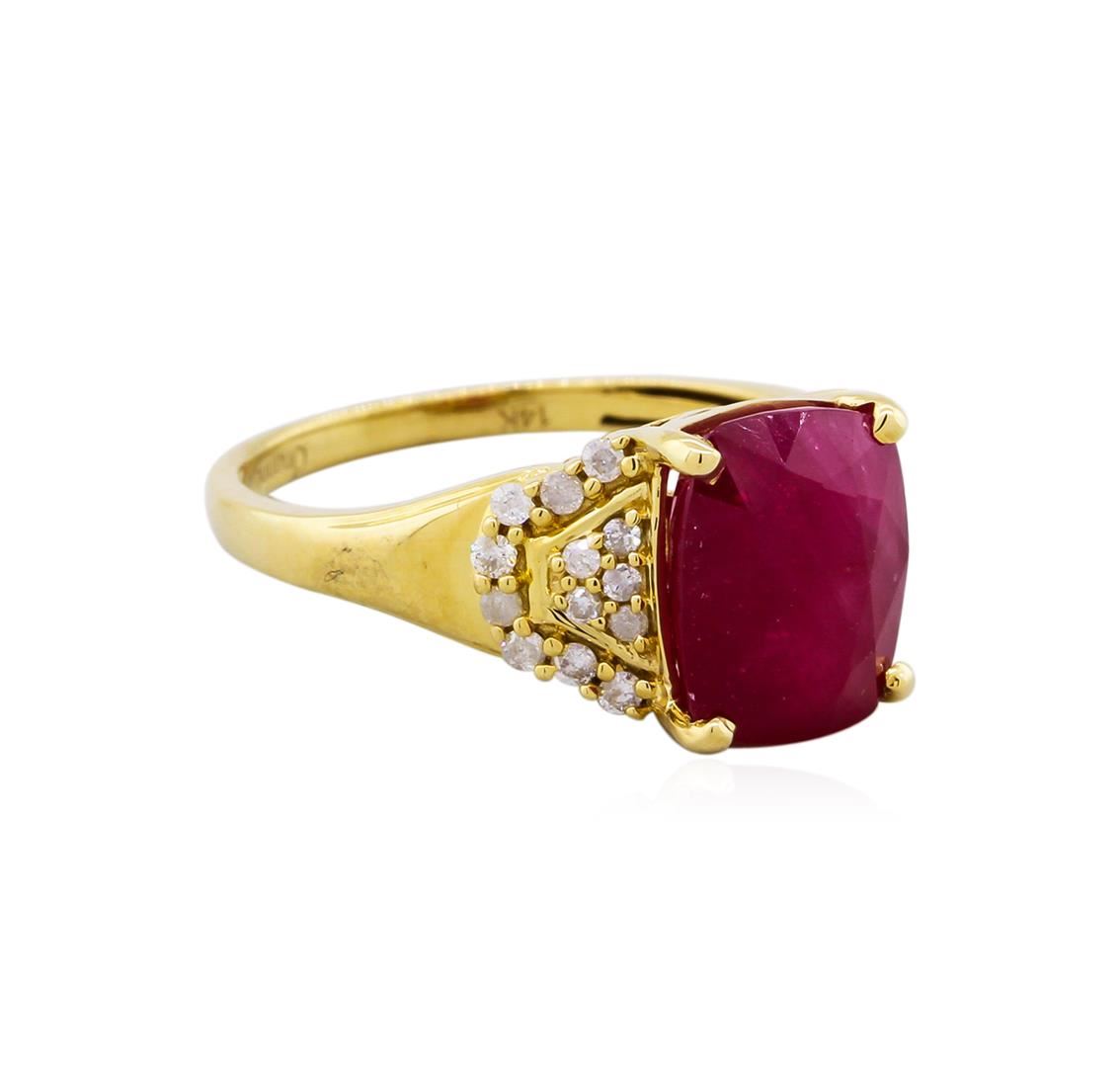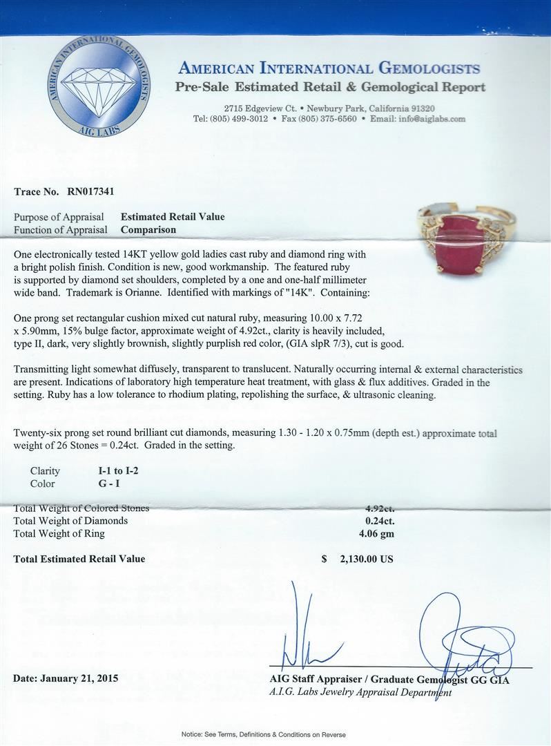 One electronically tested 14KT yellow gold ladies cast ruby and diamond ring with a bright polish finish. The featured ruby is supported by diamond set shoulders, completed by a one and one-half millimeter wide band. Trademark is Orianne. Identified with markings of "14K". Condition is new, good workmanship. Containing: One prong set rectangular cushion mixed cut natural ruby, measuring 10.00 x 7.72 x 5.90mm, 15%. bulge factor, approximate weight of 4.92ct., clarity is heavily included, type II, dark, very slightly brownish, slightly purplish red color, (GIA slpR 7/3), cut is good. Transmitting light somewhat diffusely, transparent to translucent. Naturally occurring internal & external characteristics are present. Indications of laboratory high temperature heat treatment, with glass & flux additives. Graded in the setting. Ruby has a low tolerance to rhodium plating, repolishing the surface, & ultrasonic cleaning.Twenty-Six prong set round brilliant cut diamonds, measuring 1.30 - 1.20 x 0.75mm (depth est.) approximate. Total Weight of 26 Stones = 0.24ct. Graded in the setting. Clarity: I-1 to I-2. Color: G - I. Total Weight of Colored Stones 4.92ct. Total Weight of Diamonds 0.24ct. AIG Appraised at $2,130.00.