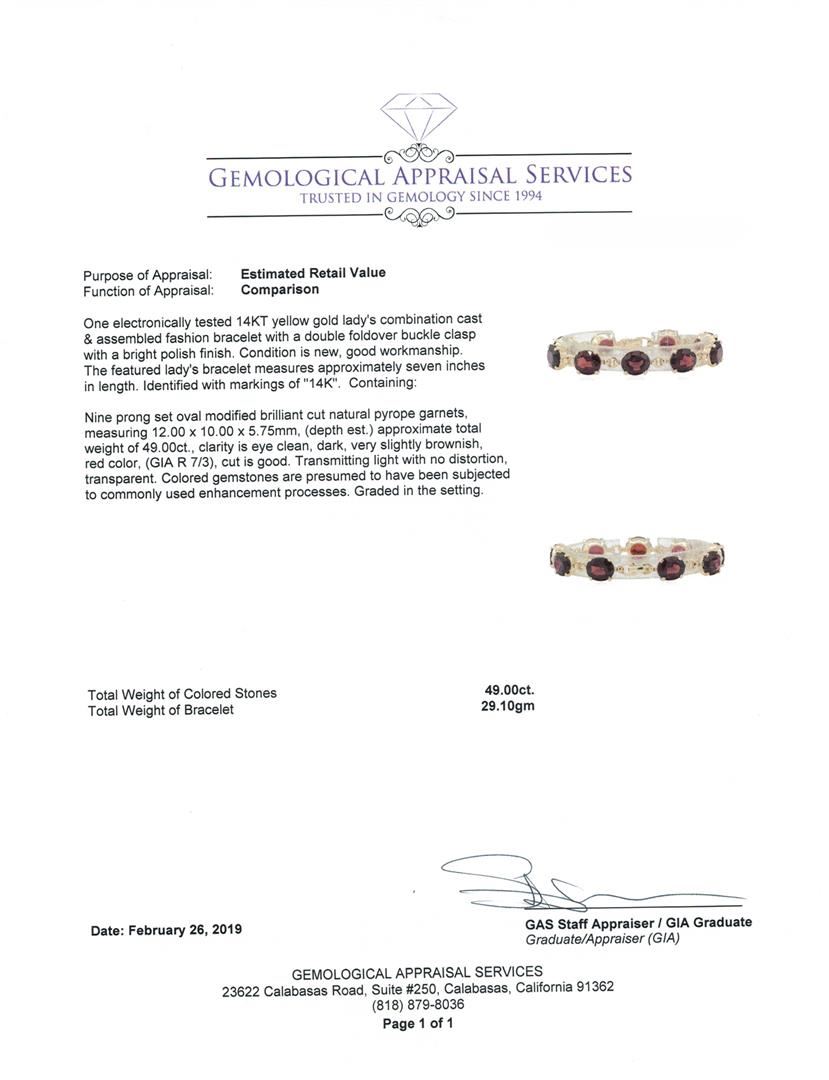 One electronically tested 14KT yellow gold lady's combination cast & assembled fashion bracelet with a double foldover buckle clasp with a bright polish finish. The featured lady's bracelet measures approximately seven inches in length. Identified with markings of '14K'. Condition is new, good workmanship. Containing: Nine prong set oval modified brilliant cut natural pyrope garnets, measuring 12.00 x 10.00 x 5.75mm, (depth est.) approximate total weight of 49.00ct.,, Clarity is eye clean, dark, very slightly brownish, red color, (GIA R 7/3), cut is good. Transmitting light with no distortion, transparent. Colored gemstones are presumed to have been subjected to commonly used enhancement processes. Graded in the setting. Total Weight of Colored Stones 49.00ct. Total Weight of Bracelet 29.10gm. GAS Appraised.