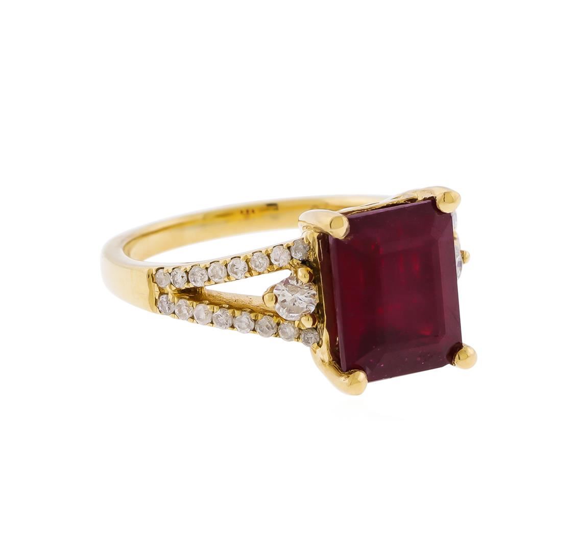 One fourteen karat (14K) yellow gold ruby and diamond ring. An emerald cut ruby corundum gemstone is prong mounted in the center of the ring. Round brilliant cut diamonds with an average clarity of I!-I2, average color of H-J, weighing 0.42 carats, accent the ring on both sides of the center gemstone. The ring is cast stamped "14K" and has a gross weight Of 5.9 Grams. GGA Appraised at $4,935.00.