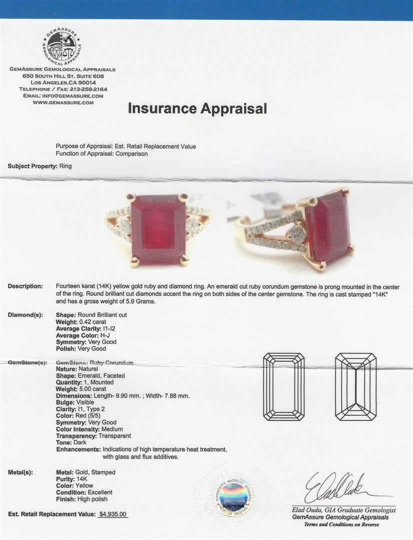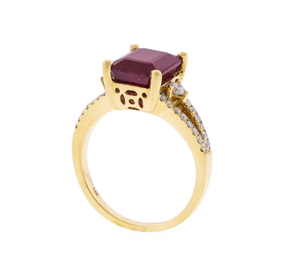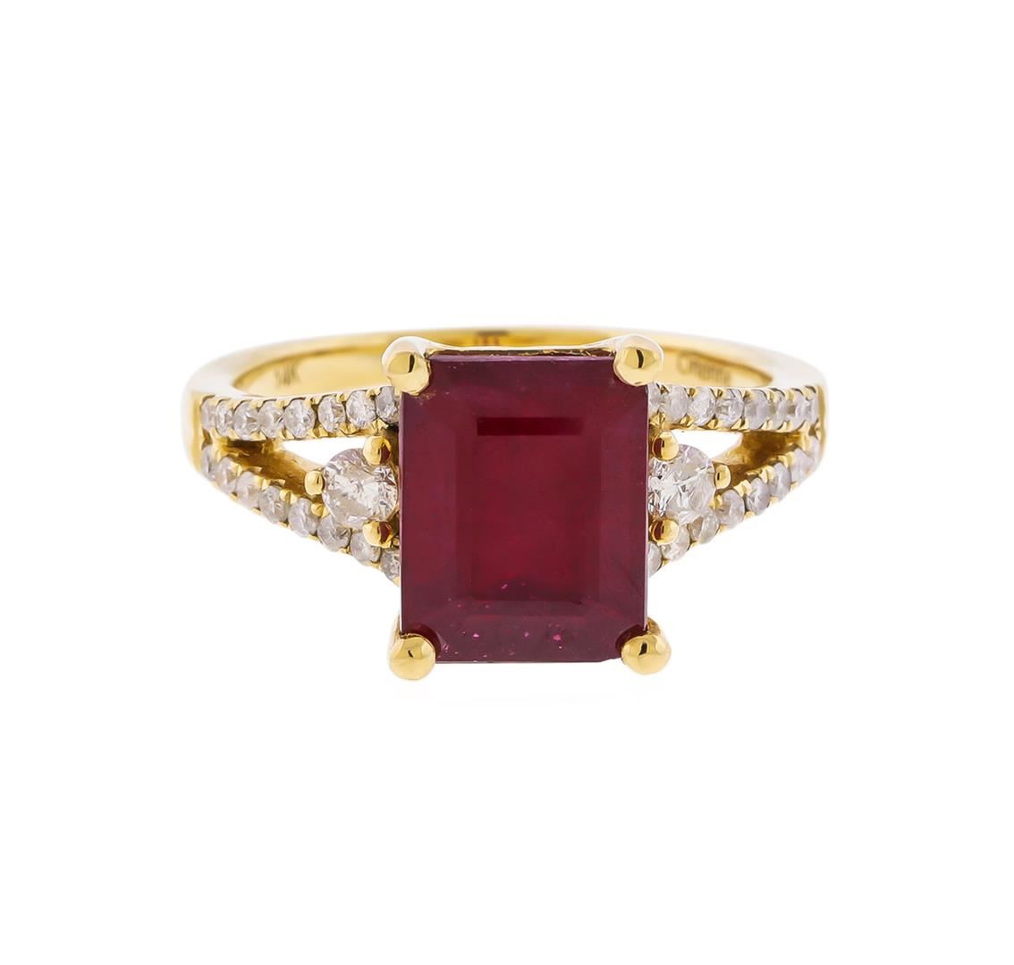 One fourteen karat (14K) yellow gold ruby and diamond ring. An emerald cut ruby corundum gemstone is prong mounted in the center of the ring. Round brilliant cut diamonds with an average clarity of I!-I2, average color of H-J, weighing 0.42 carats, accent the ring on both sides of the center gemstone. The ring is cast stamped "14K" and has a gross weight Of 5.9 Grams. GGA Appraised at $4,935.00.