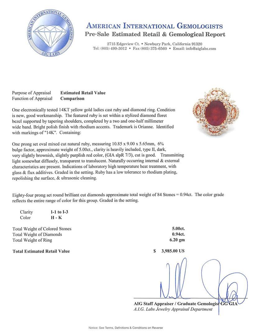 One electronically tested 14KT yellow gold ladies cast ruby and diamond ring. The featured ruby is set within a stylized diamond floret bezel supported by tapering shoulders, completed by a two and one-half millimeter wide band. Bright polish finish with rhodium accents. Trademark is Orianne. Identified with markings of "14K". Condition is new, good workmanship. Containing: One prong set oval mixed cut natural ruby, measuring 10.85 x 9.00 x 5.65mm, 6%. bulge factor, approximate weight of 5.00ct., clarity is heavily included, type II, dark, very slightly brownish, slightly purplish red color, (GIA slpR 7/3), cut is good. Transmitting light somewhat diffusely, transparent to translucent. Naturally occurring internal & external characteristics are present. Indications of laboratory high temperature heat treatment, with glass & flux additives. Graded in the setting. Ruby has a low tolerance to rhodium plating, repolishing the surface, & ultrasonic cleaning. Eighty-Four prong set round brilliant cut diamonds approximate total weight of 84 Stones = 0.94ct. The color grade reflects the entire range of color for this group. Graded in the setting. Clarity: I-1 to I-3. Color: H - K. Total Weight of Colored Stones 5.00ct. Total Weight of Diamonds 0.94ct. Total Weight of Ring 6.20gm. AIG Appraised at $3,985.00.