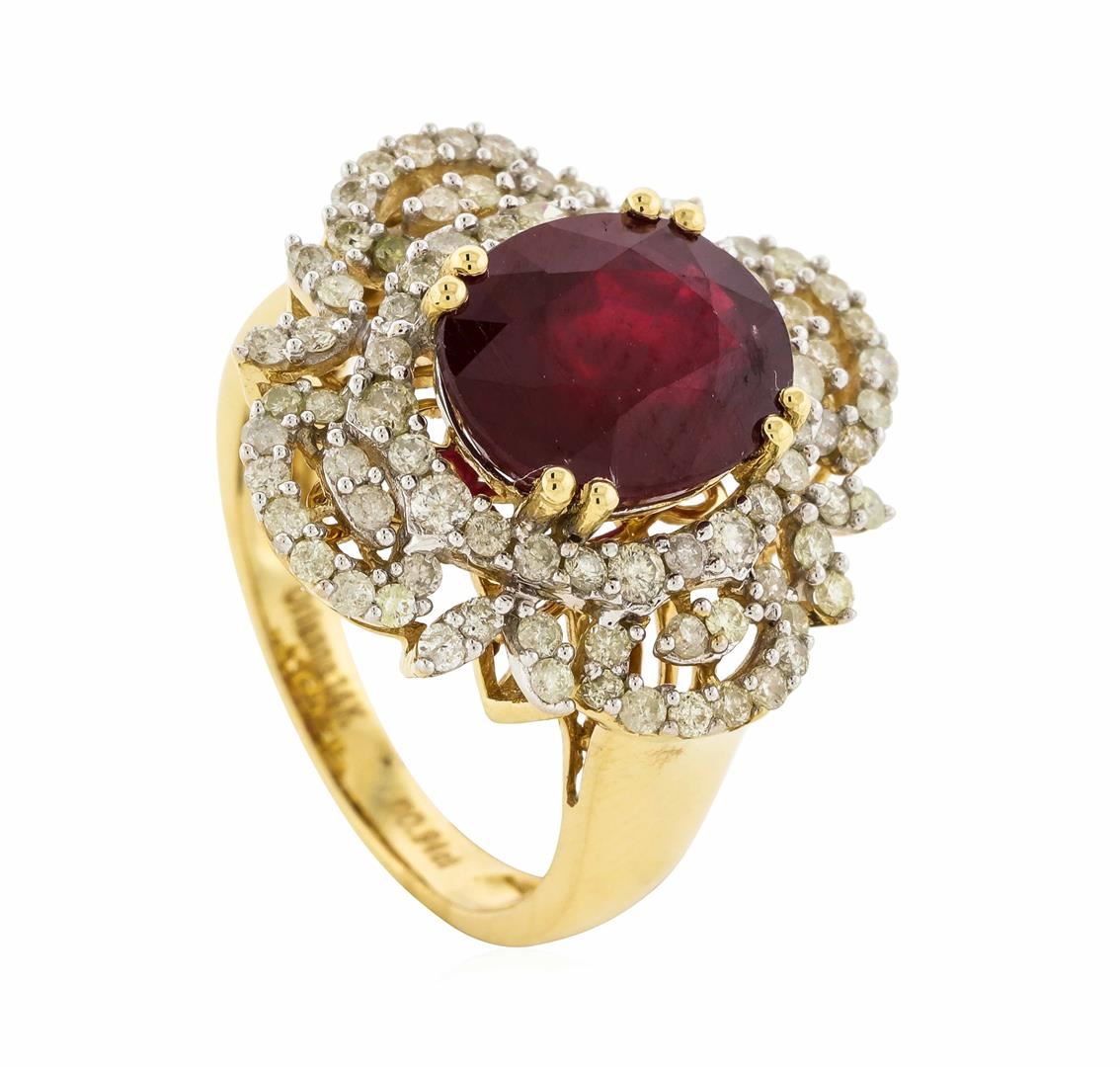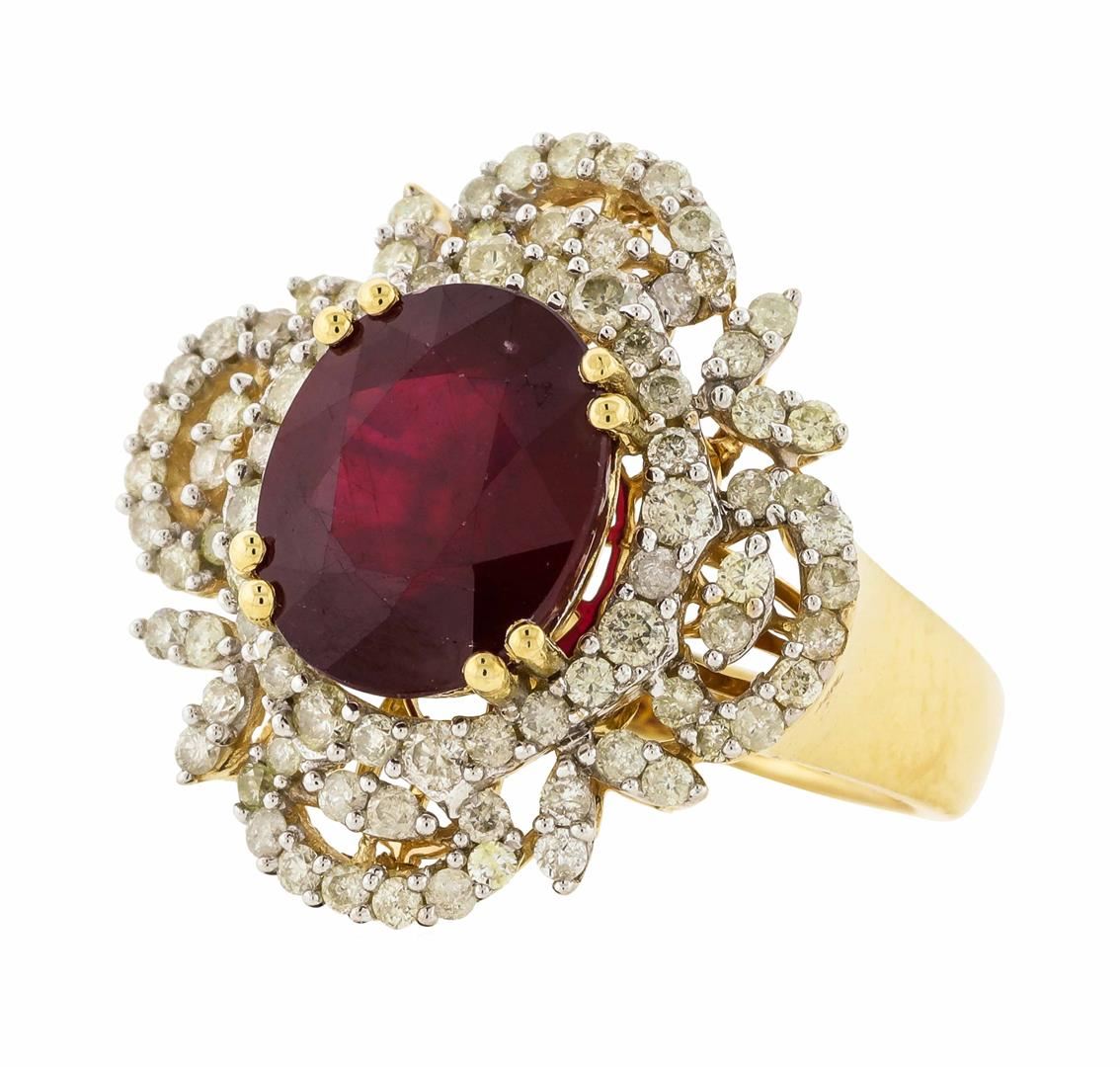 One electronically tested 14KT yellow gold ladies cast ruby and diamond ring. The featured ruby is set within a stylized diamond floret bezel supported by tapering shoulders, completed by a two and one-half millimeter wide band. Bright polish finish with rhodium accents. Trademark is Orianne. Identified with markings of "14K". Condition is new, good workmanship. Containing: One prong set oval mixed cut natural ruby, measuring 10.85 x 9.00 x 5.65mm, 6%. bulge factor, approximate weight of 5.00ct., clarity is heavily included, type II, dark, very slightly brownish, slightly purplish red color, (GIA slpR 7/3), cut is good. Transmitting light somewhat diffusely, transparent to translucent. Naturally occurring internal & external characteristics are present. Indications of laboratory high temperature heat treatment, with glass & flux additives. Graded in the setting. Ruby has a low tolerance to rhodium plating, repolishing the surface, & ultrasonic cleaning. Eighty-Four prong set round brilliant cut diamonds approximate total weight of 84 Stones = 0.94ct. The color grade reflects the entire range of color for this group. Graded in the setting. Clarity: I-1 to I-3. Color: H - K. Total Weight of Colored Stones 5.00ct. Total Weight of Diamonds 0.94ct. Total Weight of Ring 6.20gm. AIG Appraised.