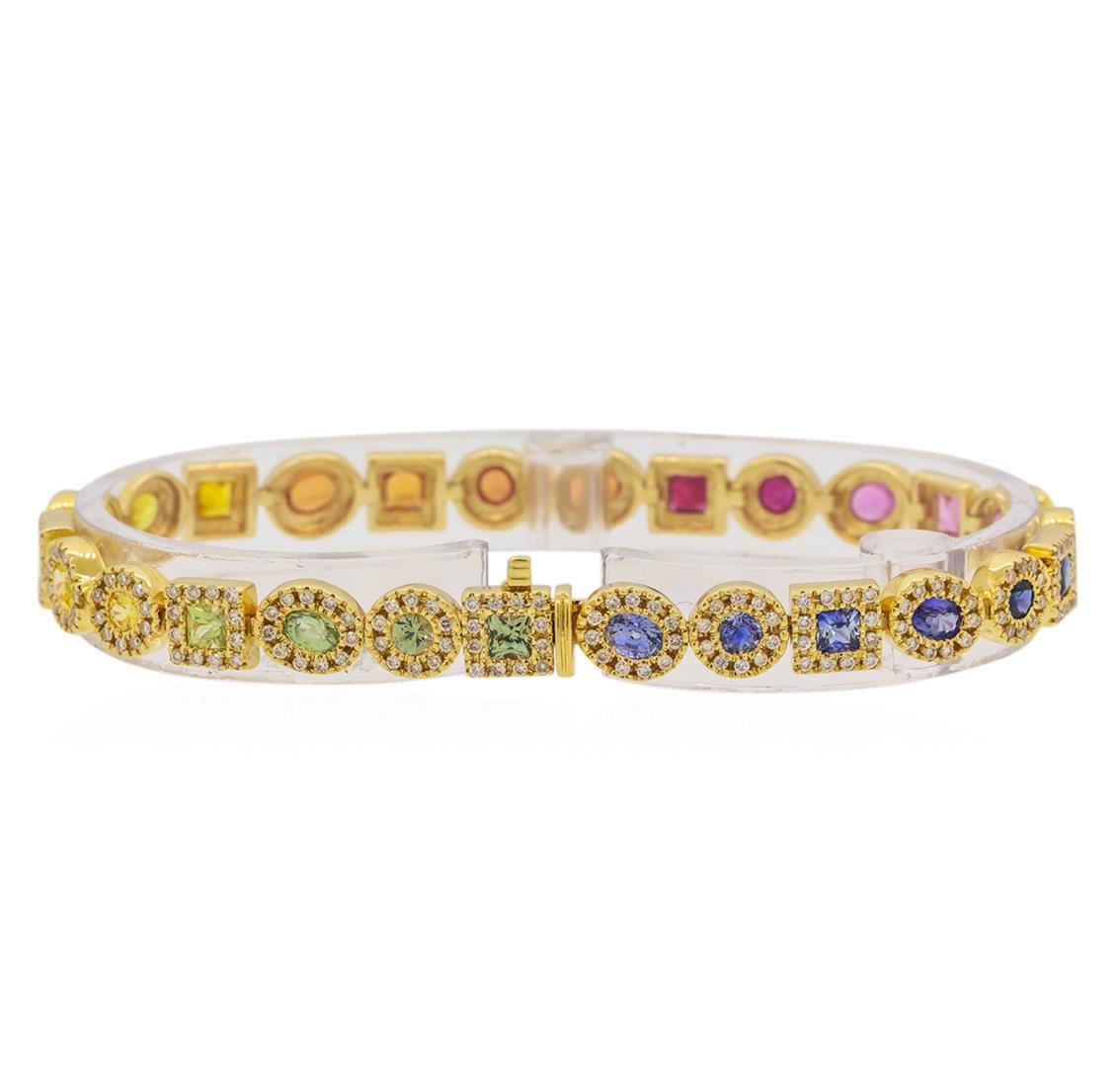 One electronically tested 14KT yellow gold lady's combination cast & assembled fashion bracelet with a tongue clasp with foldover safety with a bright polish finish. The featured lady's bracelet measures approximately 7 inches in length. Identified with markings of "14K". Condition is new, good workmanship. Containing: Nine prong set princess modified mixed cut natural multi-color sapphires, measuring 3.10 x 3.00 x 2.25mm, (depth est.) approximate total weight of 1.83ct., clarity is eye clean, cut is good. The featured sapphires range in color from blue to violetish blue to red to orange to yellow to green. Transmitting light with no distortion, transparent. Colored gemstones are presumed to have been subjected to commonly used enhancement processes. Graded in the setting.Eight prong set round modified brilliant cut natural multi-color sapphires, measuring 3.00 - 2.90 x 1.92 mm, (depth est.) approximate total weight of 1.12ct., clarity is eye clean, cut is good. The featured sapphires range in color from bluish violet to blue to pink to orange to yellow to green. Transmitting light with no distortion, transparent. Colored gemstones are presumed to have been subjected to commonly used enhancement processes. Graded in the setting.Nine prong set oval modified brilliant cut natural multi-color sapphires, measuring 4.05 x 3.00 x 2.10mm, (depth est.) 10%. bulge factor, approximate total weight of 2.16ct., clarity is eye clean, cut is good. The featured sapphires range in color from blue to pink to orange to yellow to green. Transmitting light with no distortion, transparent. Colored gemstones are presumed to have been subjected to commonly used enhancement processes. Graded in the setting.Two Hundred Eighty-Seven prong set round brilliant cut diamonds, measuring 1.15 - 1.10 x 0.68mm (depth est.) approximate total weight of 287 Stones = 1.50ct. Graded in the setting. Clarity: VS-2 to SI-1. Color: G - ICut Good. Total Weight of Colored Stones 5.11ct. Total Weight of Diamonds 1.50ct. Total Weight of Bracelet 16.10gm. GAS Appraised.