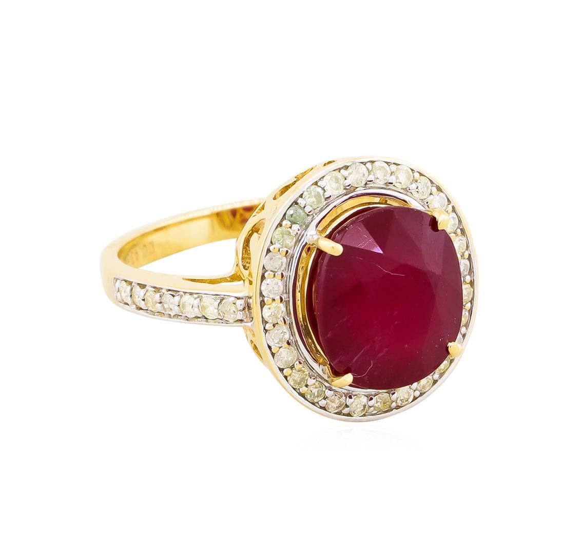 One electronically tested 14KT yellow gold ladies cast ruby and diamond ring. The featured ruby is set within a diamond bezel supported by an elaborate lattice under gallery and diamond ribbon shoulders, completed by a two millimeter wide band. Bright polish finish with rhodium accents. Trademark is Orianne. Identified with markings of "14K". Condition is new, good workmanship. Containing: One prong set oval mixed cut natural ruby approximate weight of 5.71ct., clarity is heavily included, type II, medium dark, very slightly brownish, slightly purplish red color, (GIA slpR 6/3), cut is good. Transmitting light somewhat diffusely, transparent to translucent. Naturally occurring internal & external characteristics are present. Indications of laboratory high temperature heat treatment, with glass & flux additives. Graded in the setting. Ruby has a low tolerance to rhodium plating, repolishing the surface, & ultrasonic cleaning.Forty-Two prong set round brilliant cut diamonds approximate. Total Weight of 42 Stones = 0.43ct. Graded in the setting. Clarity: I-1 to I-3. Color: I - K. Total Weight of Colored Stones 5.71ct. Total Weight of Diamonds 0.43ct. Total Weight of Ring 4.83gm. AIG Appraised at $2,630.00.