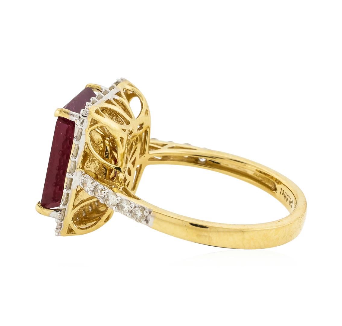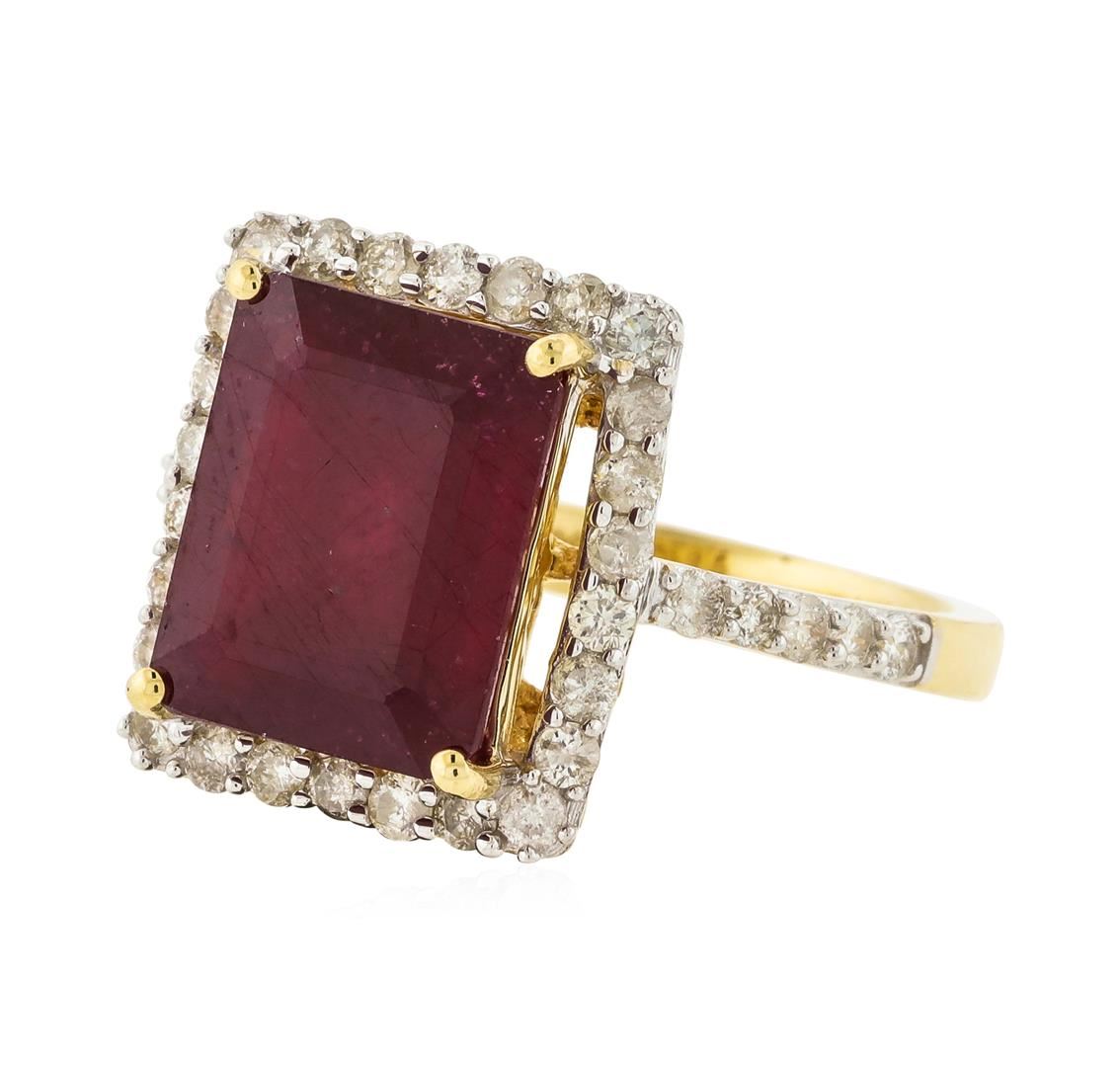 One electronically tested 14KT yellow gold ladies cast ruby and diamond ring. The featured ruby is set within a diamond bezel supported by a lattice under gallery and diamond set shoulders, completed by a two millimeter wide band. Bright polish finish with rhodium accents. Trademark is Orianne. Identified with markings of "14K". Condition is new, good workmanship. Containing: One prong set rectangular step cut natural ruby, measuring 11.00 x 9.00 x 4.90mm, approximate weight of 5.96ct., clarity is heavily included, dark, very slightly brownish, slightly purplish red color, (GIA slpR 7/3), cut is good. Transmitting light somewhat diffusely, transparent to translucent. Naturally occurring internal & external characteristics are present. Indications of laboratory high temperature heat treatment, with glass & flux additives. Graded in the setting. Ruby has a low tolerance to rhodium plating, repolishing the surface, & ultrasonic cleaning. Thirty-Six prong set round brilliant cut diamonds approximate total weight of 36 Stones = 0.68ct. Graded in the setting. Clarity: I-1 to I-3. Color: G - I. Total Weight of Colored Stones 5.96ct. Total Weight of Diamonds 0.68ct. Total Weight of Ring 5.20gm. AIG Appraised.
