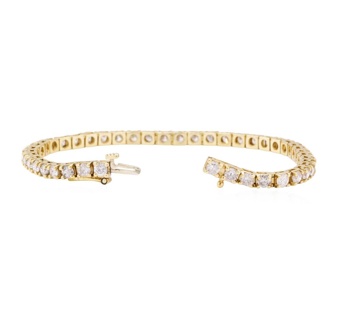 One electronically tested 14KT yellow gold lady's combination cast & assembled fashion tennis bracelet with a tongue clasp & foldover safety with a bright polish finish. The featured lady's bracelet measures approximately seven inches in length. Identified with markings of '14K'. Condition is like new, good workmanship. Containing: Forty-Four prong set round brilliant cut diamonds, measuring 3.34 - 3.25 x 2.10mm (depth est.) approximate total weight of 44 Stones = 6.25ct. Graded in the setting. Color H - I, Clarity SI-2 to I-1, Cut Good. Total Weight of Diamonds 6.25ct. Total Weight of Bracelet 13.70gm. GAS Appraised.