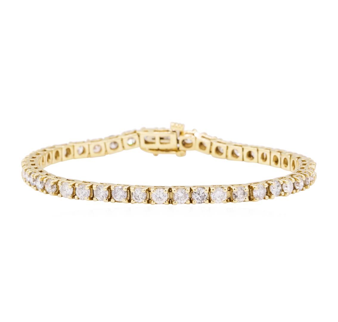 One electronically tested 14KT yellow gold lady's combination cast & assembled fashion tennis bracelet with a tongue clasp & foldover safety with a bright polish finish. The featured lady's bracelet measures approximately seven inches in length. Identified with markings of '14K'. Condition is like new, good workmanship. Containing: Forty-Four prong set round brilliant cut diamonds, measuring 3.34 - 3.25 x 2.10mm (depth est.) approximate total weight of 44 Stones = 6.25ct. Graded in the setting. Color H - I, Clarity SI-2 to I-1, Cut Good. Total Weight of Diamonds 6.25ct. Total Weight of Bracelet 13.70gm. GAS Appraised.