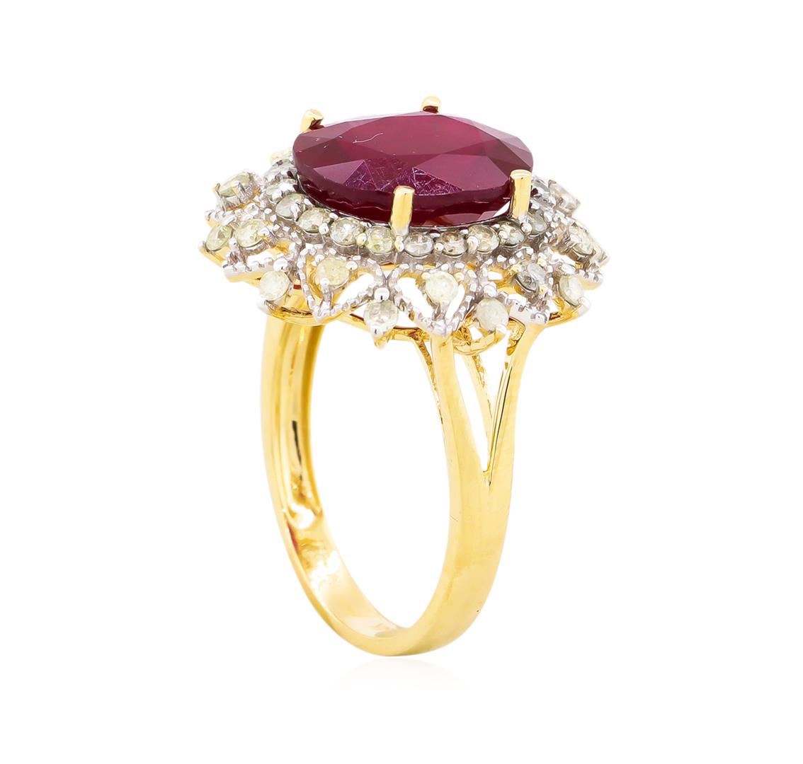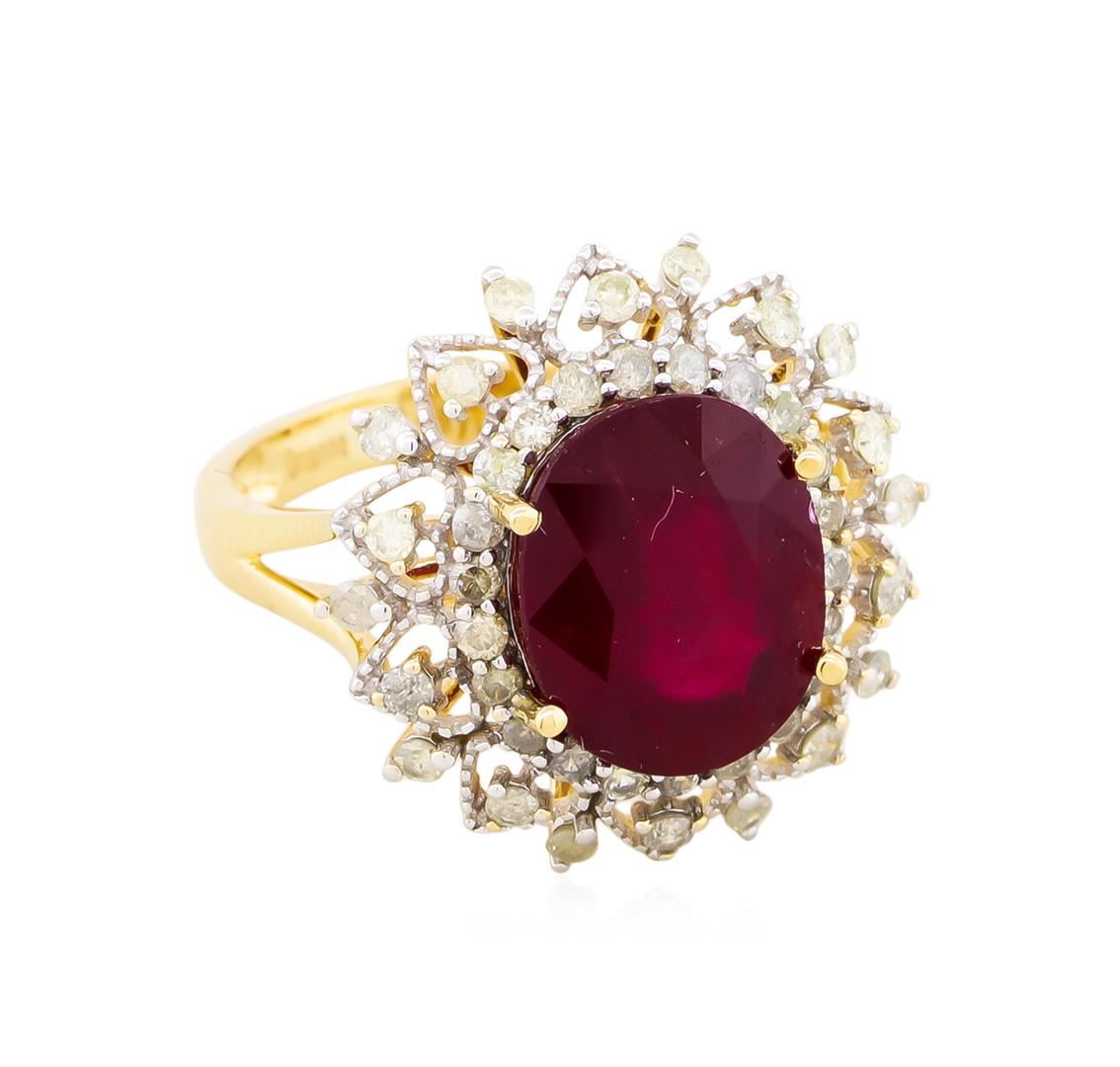 One electronically tested 14KT yellow gold ladies cast ruby and diamond ring. The featured ruby is set within a stylized diamond floret supported by split shoulders, completed by a two millimeter wide band. Bright polish finish with rhodium accents. Trademark is Orianne. Identified with markings of "14K". Condition is new, good workmanship. Containing: One prong set oval mixed cut natural ruby approximate weight of 6.31ct., clarity is moderately included, type II, medium dark, very slightly brownish, slightly purplish red color, (GIA slpR 6/3), cut is good. Transmitting light somewhat diffusely, transparent to translucent. Naturally occurring internal & external characteristics are present. Indications of laboratory high temperature heat treatment, with glass & flux additives. Graded in the setting. Ruby has a low tolerance to rhodium plating, repolishing the surface, & ultrasonic cleaning.Forty-Two prong set round brilliant cut diamonds approximate. Total Weight of 42 Stones = 0.82ct. Graded in the setting. Clarity: I-1 to I-3. Color: I - K. Total Weight of Colored Stones 6.31ct. Total Weight of Diamonds 0.82ct. Total Weight of Ring 5.14gm. AIG Appraised at $3,305.00.