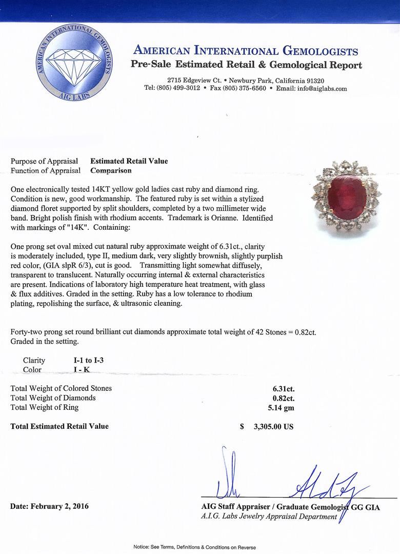 One electronically tested 14KT yellow gold ladies cast ruby and diamond ring. The featured ruby is set within a stylized diamond floret supported by split shoulders, completed by a two millimeter wide band. Bright polish finish with rhodium accents. Trademark is Orianne. Identified with markings of "14K". Condition is new, good workmanship. Containing: One prong set oval mixed cut natural ruby approximate weight of 6.31ct., clarity is moderately included, type II, medium dark, very slightly brownish, slightly purplish red color, (GIA slpR 6/3), cut is good. Transmitting light somewhat diffusely, transparent to translucent. Naturally occurring internal & external characteristics are present. Indications of laboratory high temperature heat treatment, with glass & flux additives. Graded in the setting. Ruby has a low tolerance to rhodium plating, repolishing the surface, & ultrasonic cleaning.Forty-Two prong set round brilliant cut diamonds approximate. Total Weight of 42 Stones = 0.82ct. Graded in the setting. Clarity: I-1 to I-3. Color: I - K. Total Weight of Colored Stones 6.31ct. Total Weight of Diamonds 0.82ct. Total Weight of Ring 5.14gm. AIG Appraised at $3,305.00.